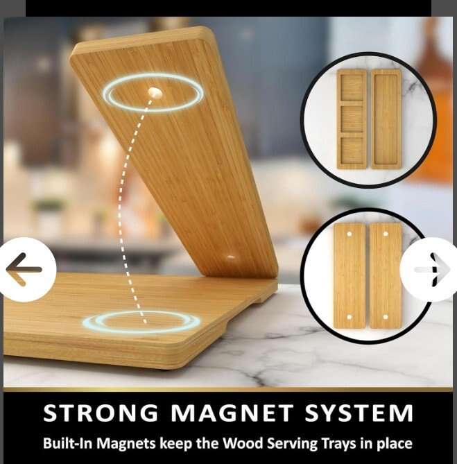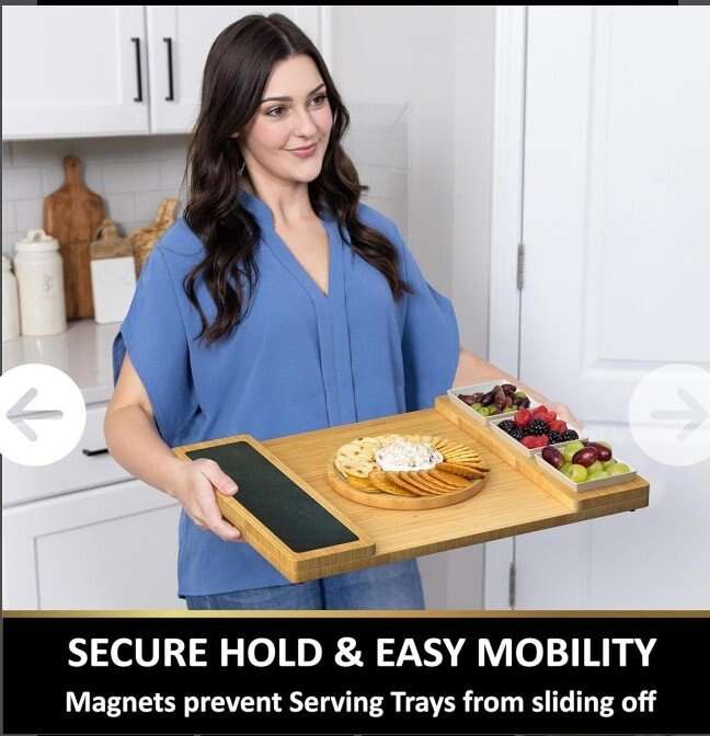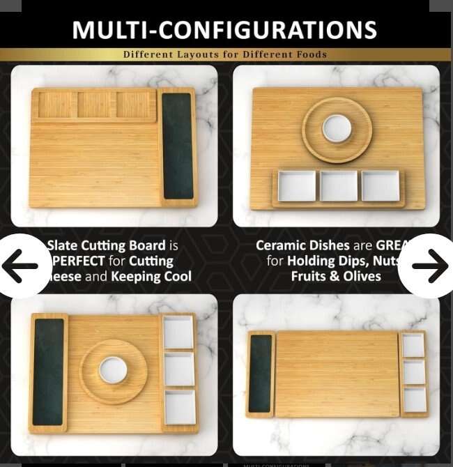 VenmoMULTI-CONFIGURABLE Cheese board and each tray includes concealed built-in magnets preventing the trays from sliding off but allowing for multiple configurations to be set. Change the board to any layout of your choosing with magnetic removable trays. Design your platter based on what you are serving. PREMIUM BAMBOO All-Natural Bamboo wood is extremely durable and water-resistant. Our boards and trays are crafted with such precision and brushed down to a luxury smooth touch of fine furniture. From the beautiful coloring of the wood to the smoothest surface, no other board compares in quality. QUALTY SERVING All ceramic and slate trays are removable from the wood trays for additional serving. The ramekin and serving bowls are made with high quality ceramic and designed with an inner glaze for a fine smooth surface. Ceramic dishes are great for holding dips, nuts, fruits and olives. PREMIUM SLATE Slate cutting board is perfect for cutting cheese and meats to avoid any damage to the wood board. Natural stone is cold and helps keep the food cool and prevents food from drying out. Placing your cheese and meats on the stone also adds for a quality design and prestigious look. ALL-IN-ONE SET Luxury set includes 15 x 20 cheese board, (3) square ceramic bowls with wood tray, chip & dip tray with ceramic ramekin and removable slate cutting board with wood tray.