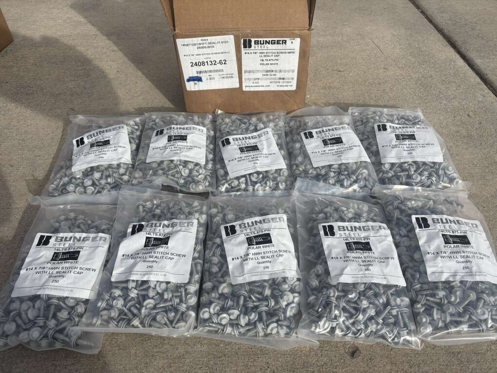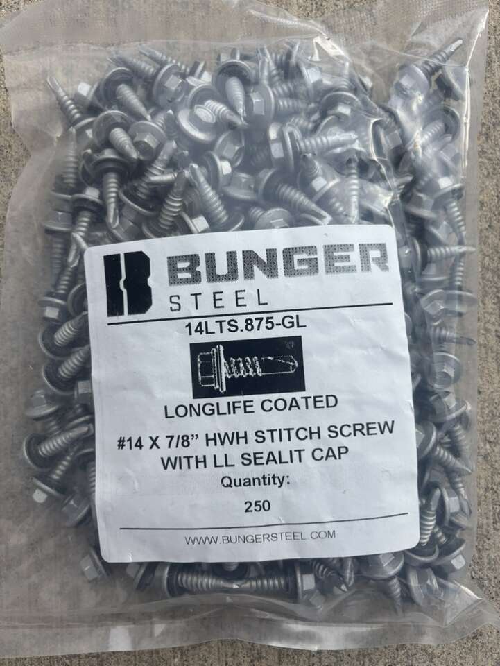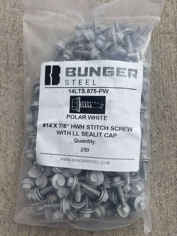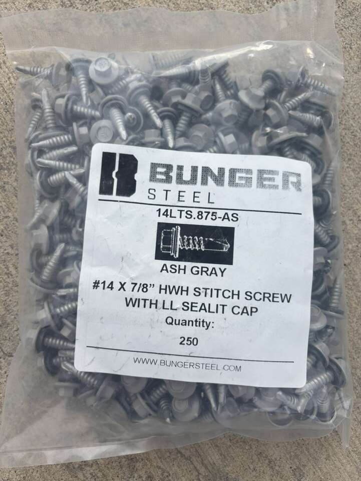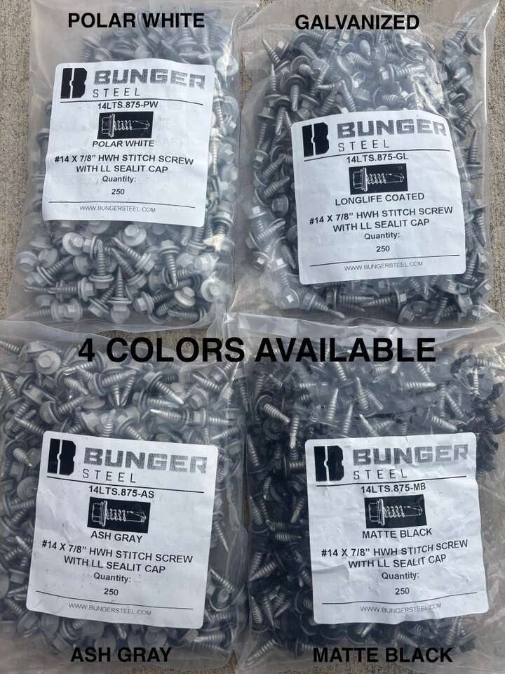 Description- Box of 2500 (10 bags of 250) #14X7/8” HWH stitch screws with LL SEALIT Cap in your choice of Polar White, Ash Gray, Matte Black or Long Life Galvanized Coating. ONLY SOLD BY THE BOX OF 2500. See photos for more product information and specifications.