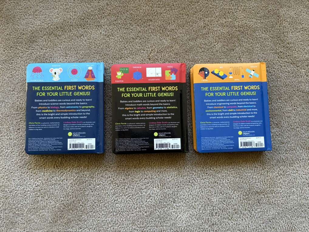 Three Science Board Books, by Chris Ferrie and Lindsay Dale-Scott: My First 100 Science Words, My First 100 Mathematics Words, and My First 100 Engineering Words. Source Books. 3 sturdy board books in excellent condition, like new. Text only. Cash or Venmo.