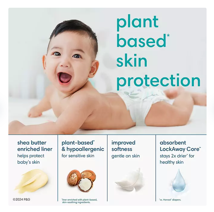 Pampers has thoughtfully chosen all of their ingredients to care for your baby's precious skin. Their exclusive, plant-based liner** is enriched with shea butter to help nourish and protect skin while the outer cover is enhanced with premium cotton, making Pampers Pure Protection diapers irresistibly soft and breathable. But the ingredients Pampers has chosen to leave out are just as important. That's why Pampers Pure Protection diapers are free of chlorine bleaching, fragrance, parabens, and latex* and are hypoallergenic.
