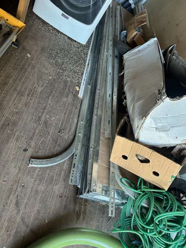 Dark brown 8' tall x 10' wide Never been used. We got the wrong size when building our home. It has been in storage for about 6 or 7 years. I believe it has all the tracks and parts except the opener. Picture of door installed is not door being sold. Just to show color and what it looks like.