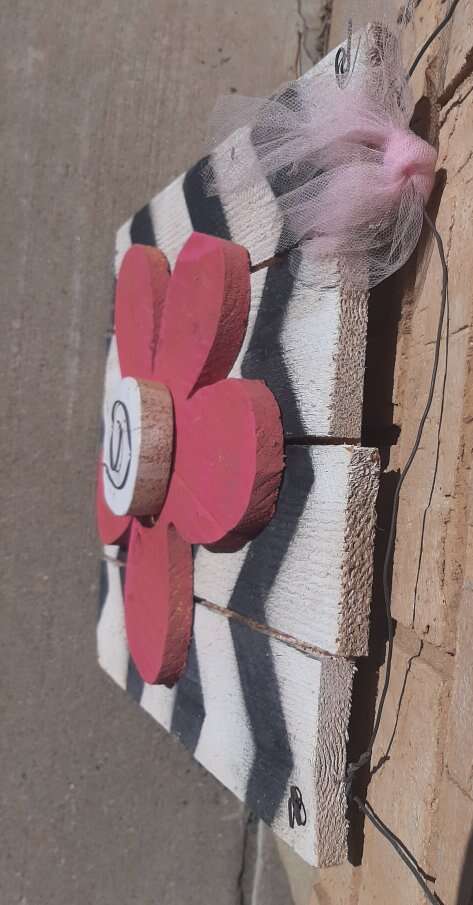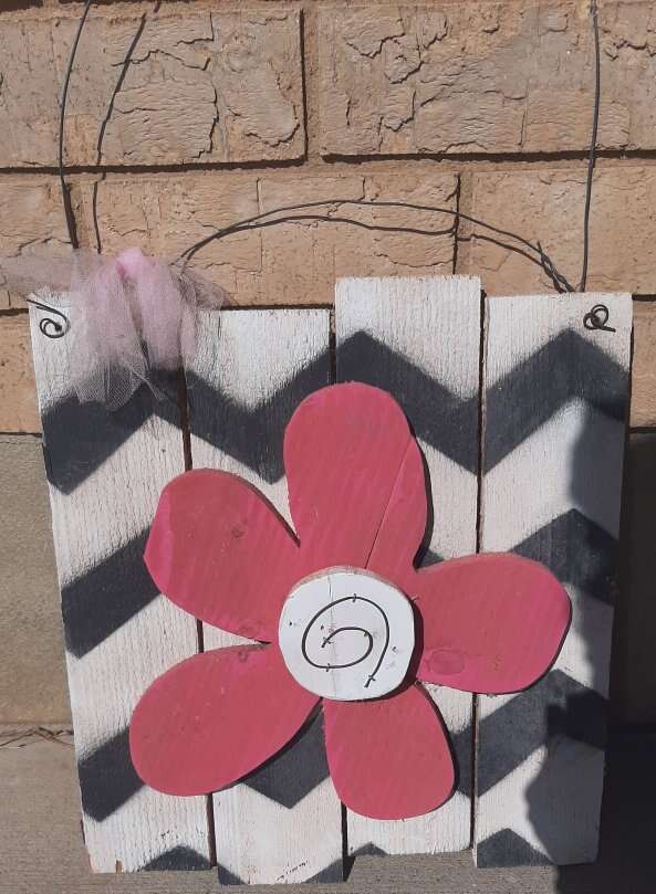 Wood Wooden Flower Door Hanger Chevron Handmade Good condition. Fun and Rustic door / wall hanging decor. 3D red/pink flower with black & white chevron pattern. Has two wire hangers for different height hanging. (Easily removable) Smoke free. Measures: 15" tall, 14" wide, 3" deep