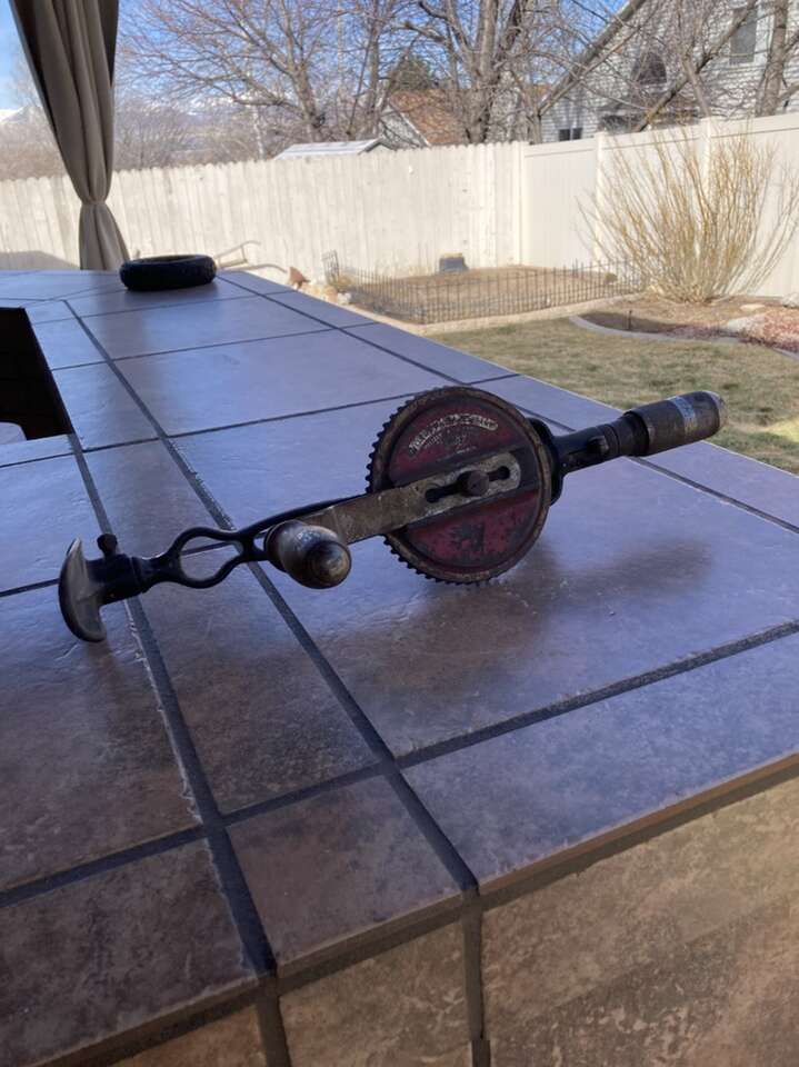 From the late 1800s-early 1900s. Miller falls MFG co.#12 with shoulder breast brace. Early two jaw chuck. Original patina and shop dirt no rust. Handles in great condition. Everything works.built in level still works.