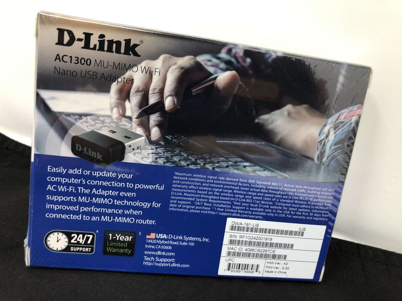 Brand new, sealed D-Link AC1300 dual band Wi-Fi Nano USB adapter. Add or update your computer connection to AC Wi-Fi. It's dual band. USB 2.0. The model # is DWA-181. It comes with an installation guide.
