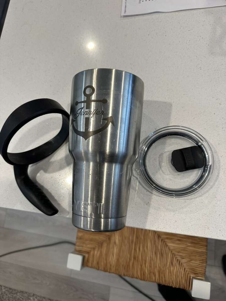 Stainless steel 20 ounce coffee mug with handle logo name Jennifer on it, if your name is not Jennifer, you can still get it because the handle covers the name if you like yours today in Grantsville $15