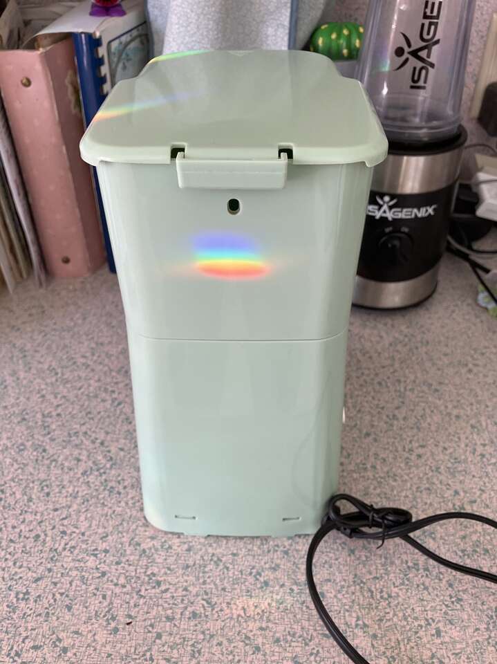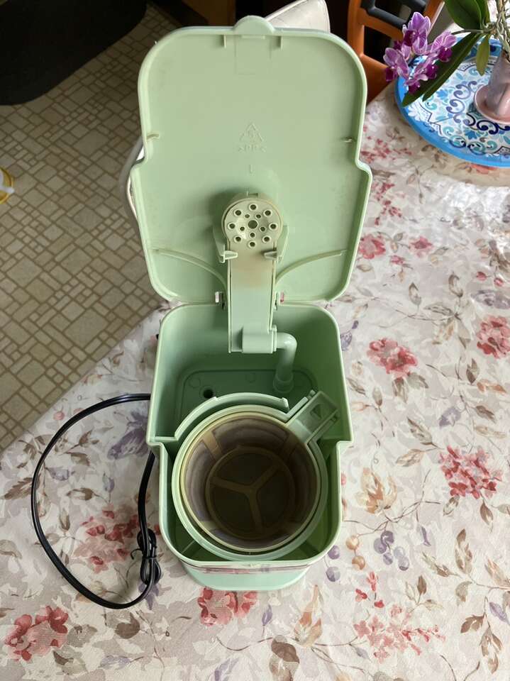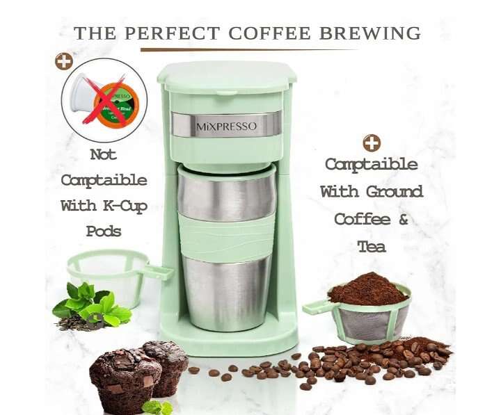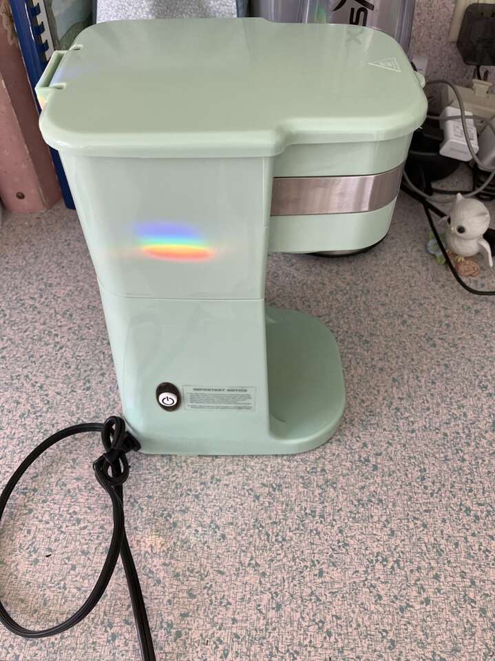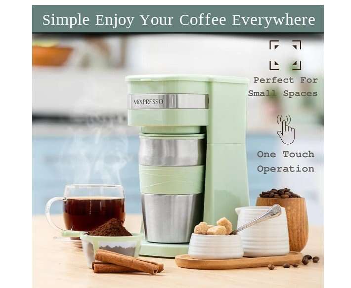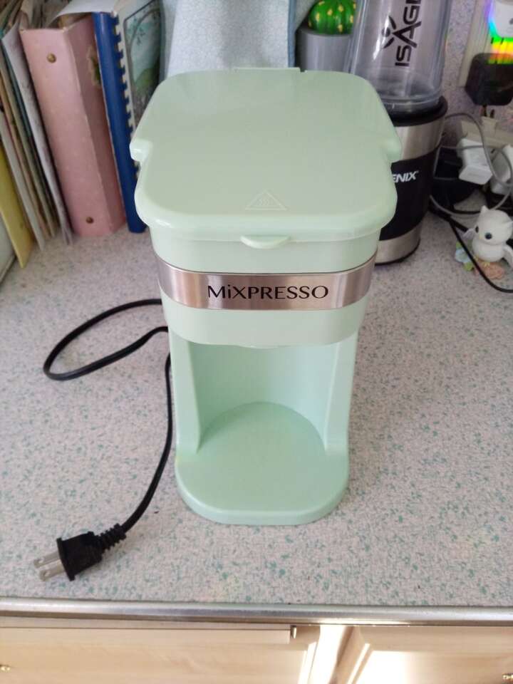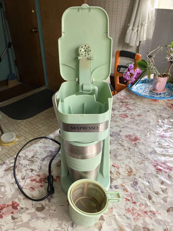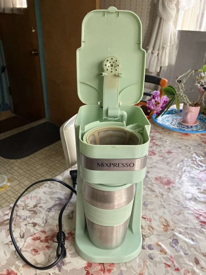 Very good condition small counter top coffee maker holds 14oz, insulated travel cup and filter pieces have been run through the dishwasher.