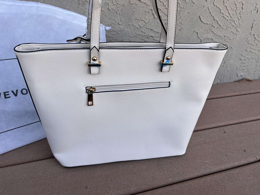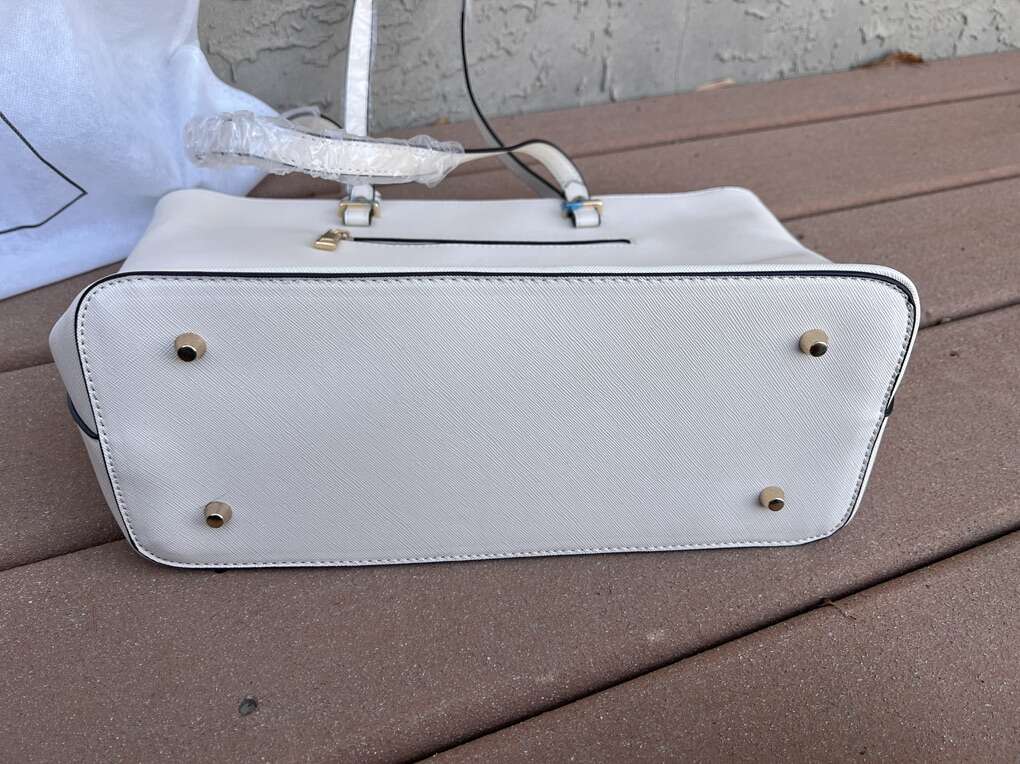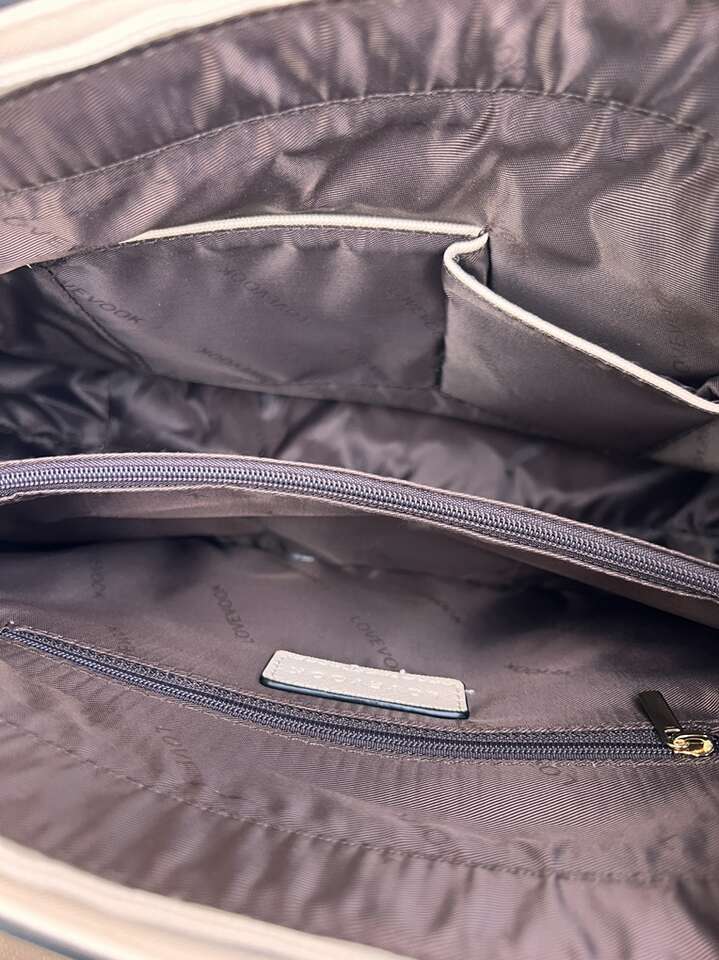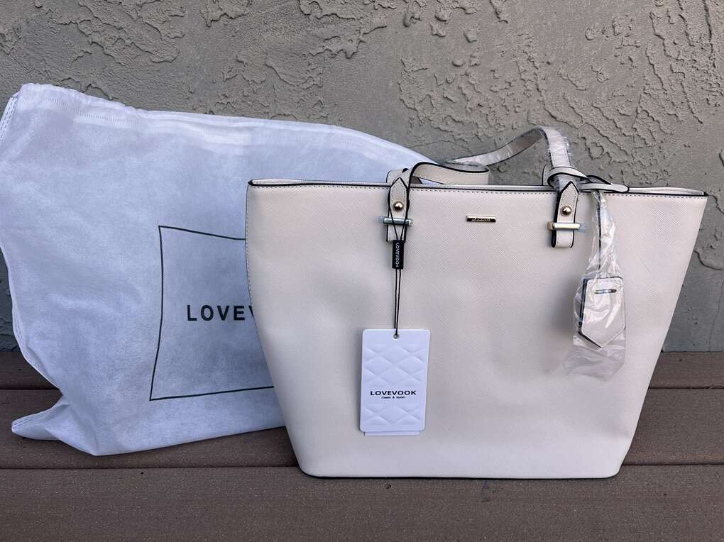 VenmoBrand new with tags Lovevook tote in a cream faux leather vinyl. Lots of interior pockets. Can hold a laptop too. 10 t 15.5 w 5 d across the bottom. Comes with a document holder and coordinating small zippered wallet. Dust jacket included also. Pick up in Draper. Smoke free home. Cash or Venmo. $40.