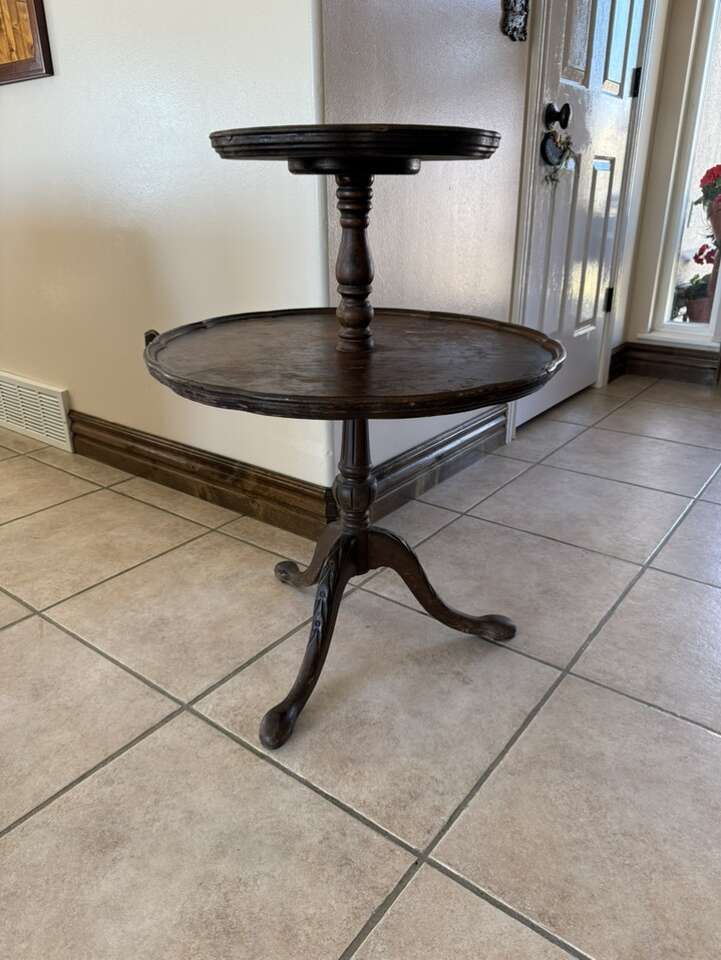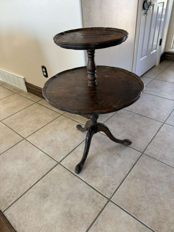 Tall antique tiered table 33” T 24” W does have damage on top.