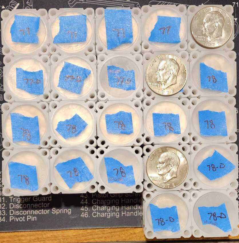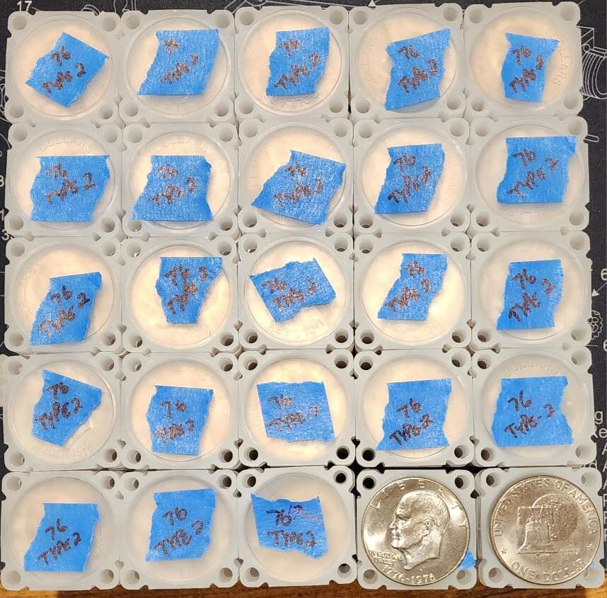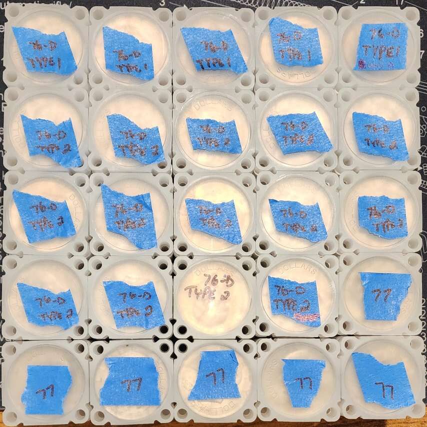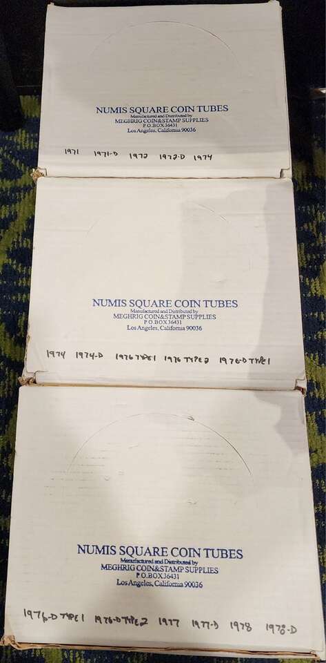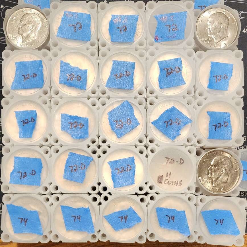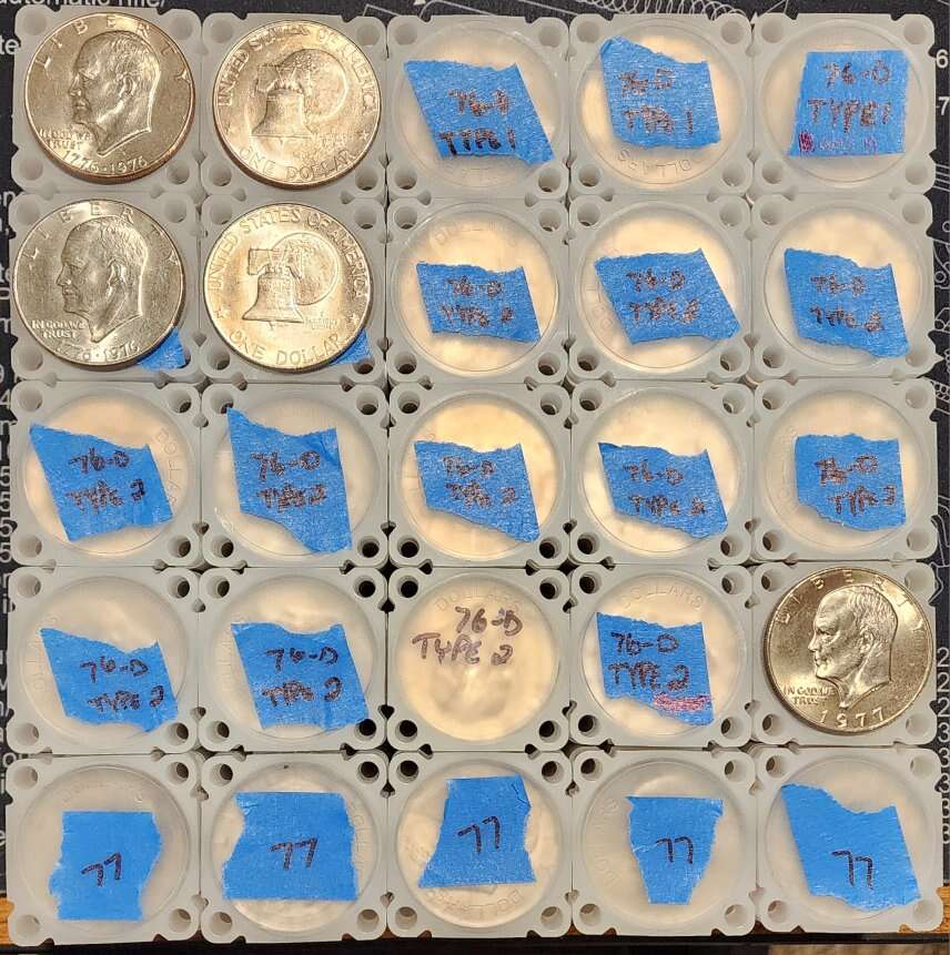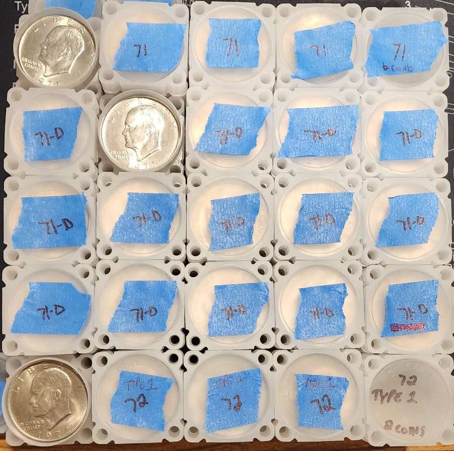 ZelleI have my Grandfather's collection of Eisenhower Dollar coins. Each is in better than circulated condition, many AU. Each is in a Numis Square Coin Tube. All are separated by year and mint mark as well as type. The set is meant to be sold as a whole and not to be picked through. Included in this collection are many of the very valuable and sought after 1972 Type 1 and Type 3 varieties. There are no 1973 or 1973-D coins as these were part of a special mint set. Below is the inventory of all the coins he had: 1971--86 1971-D--300 1972 Type 1--82 1972 Type 3--62 1972-D--291 1974--145 1974-D--128 1976 Type 1--10 1976 Type 2--757 1976-D Type 1--139 1976-D Type 2--280 1977--200 1977-D--68 1978--193 1978-D--72