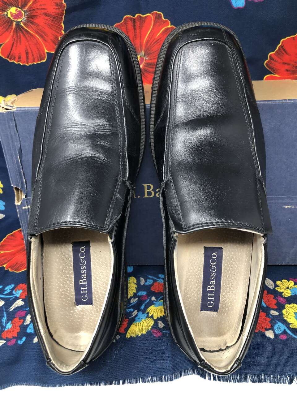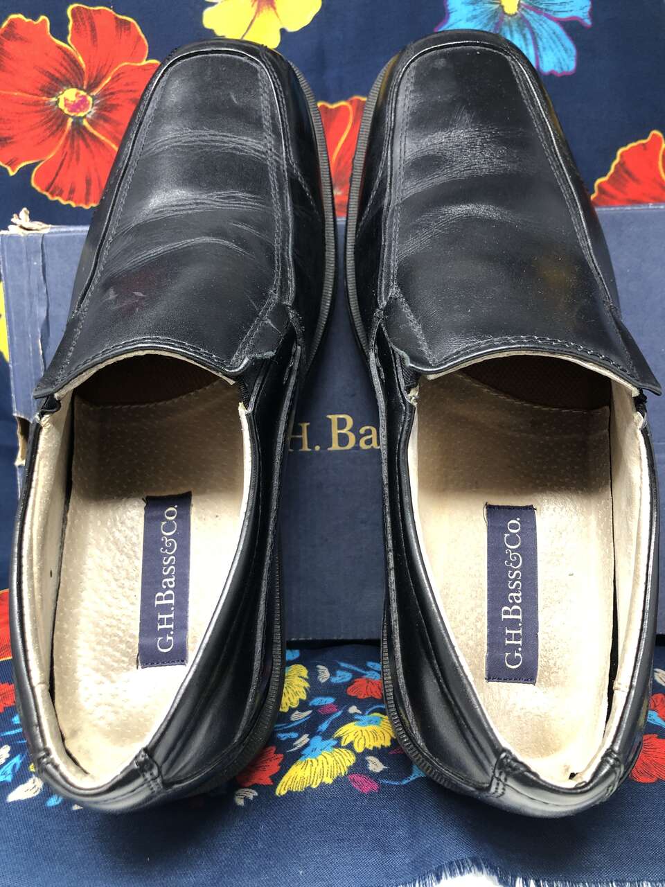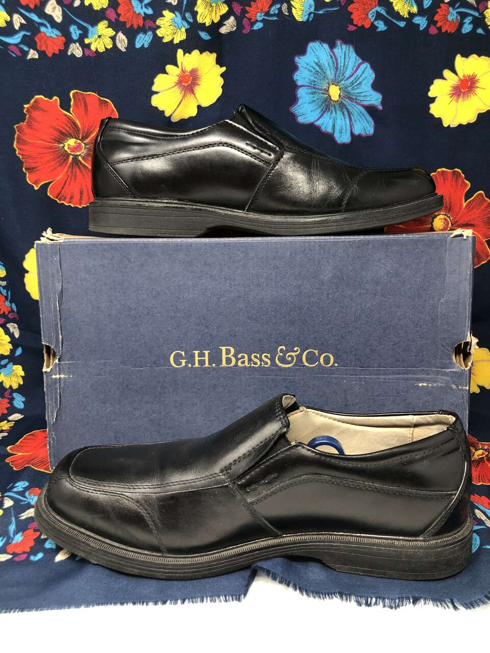 VenmoMen's size 10 G.H. Bass & Co. leather slip-on dress shoes with shoe stretcher/shapers included. The shoe stretchers are adjustable. Simply squeeze the two metal prongs together to release it from the foldable edge with the holes. Replace it in the holes you desire to fit other shoe sizes. They are really easy to use and help maintain the quality of your shoes. The shoes are very high quality. They are hand-made and the stitching is immaculate. The scuff marks from being worn are shown in photos. Original box is included and worn around the edges of the lid.