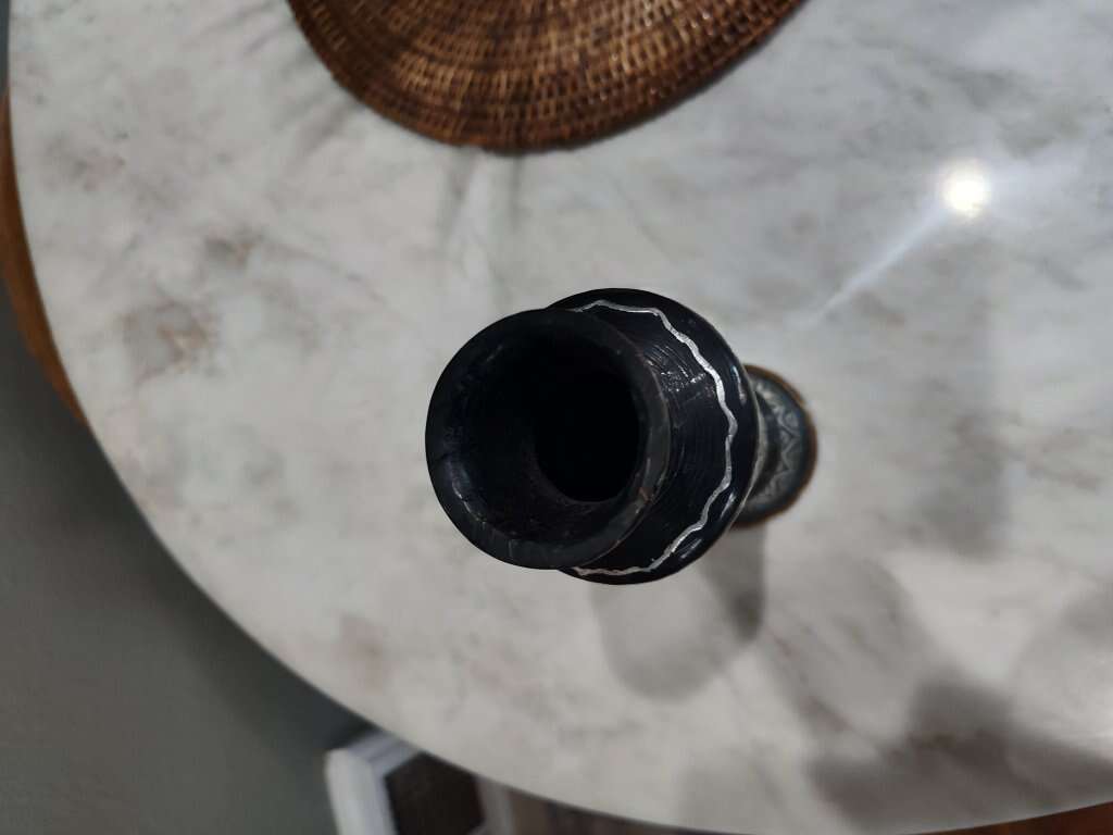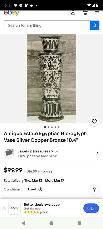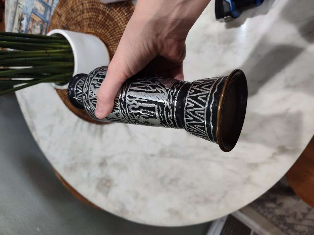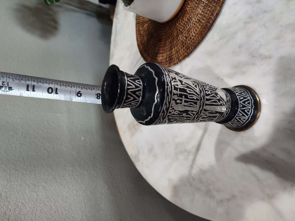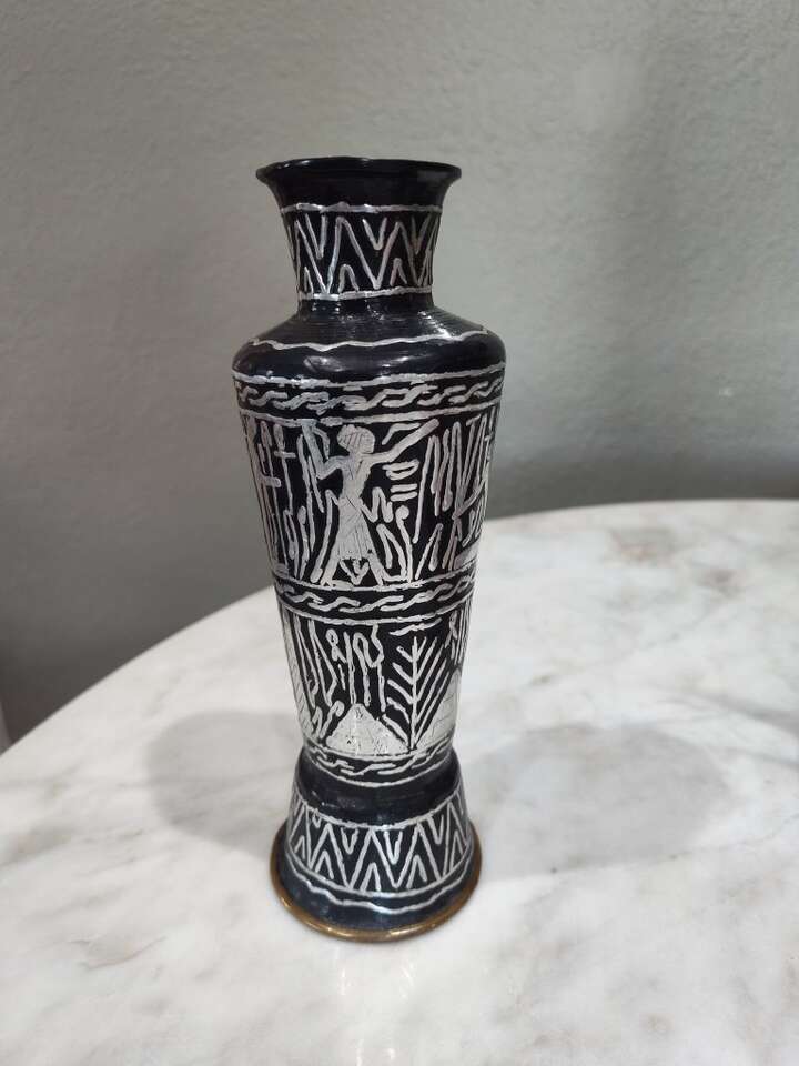 Brass hieroglyphic vase with black and silver etching. Really cool piece! Others are selling for around $100