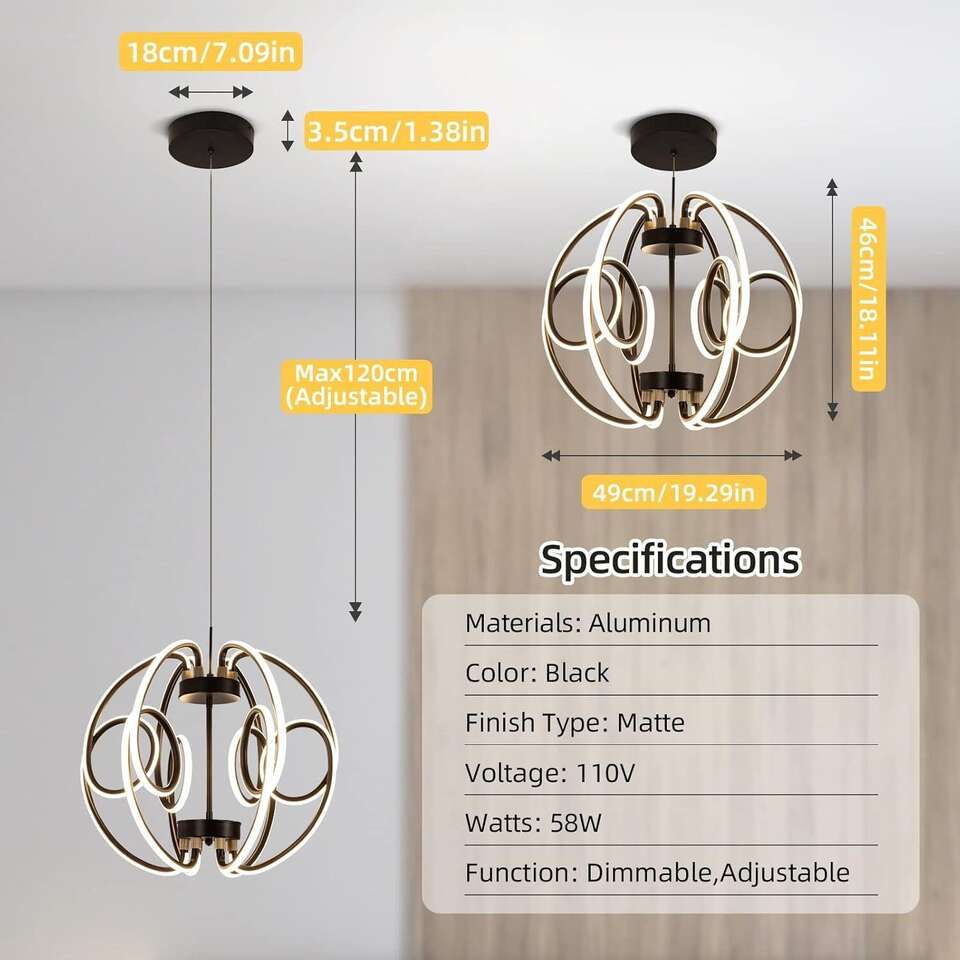 [Specifications]: The led modern chandelier works with the voltage of 110V and the power of 58W for the room size from 105 square feet to 177 square feet.This led chandelier gives off dimmable and adjustable light from 3000k warm light to 6000k cold light and brightness from 0% to 100%. The led chandelier features reliable aluminum materials with the size of D19.3in*H18.1in suitable for bedroom, entryway and so on.