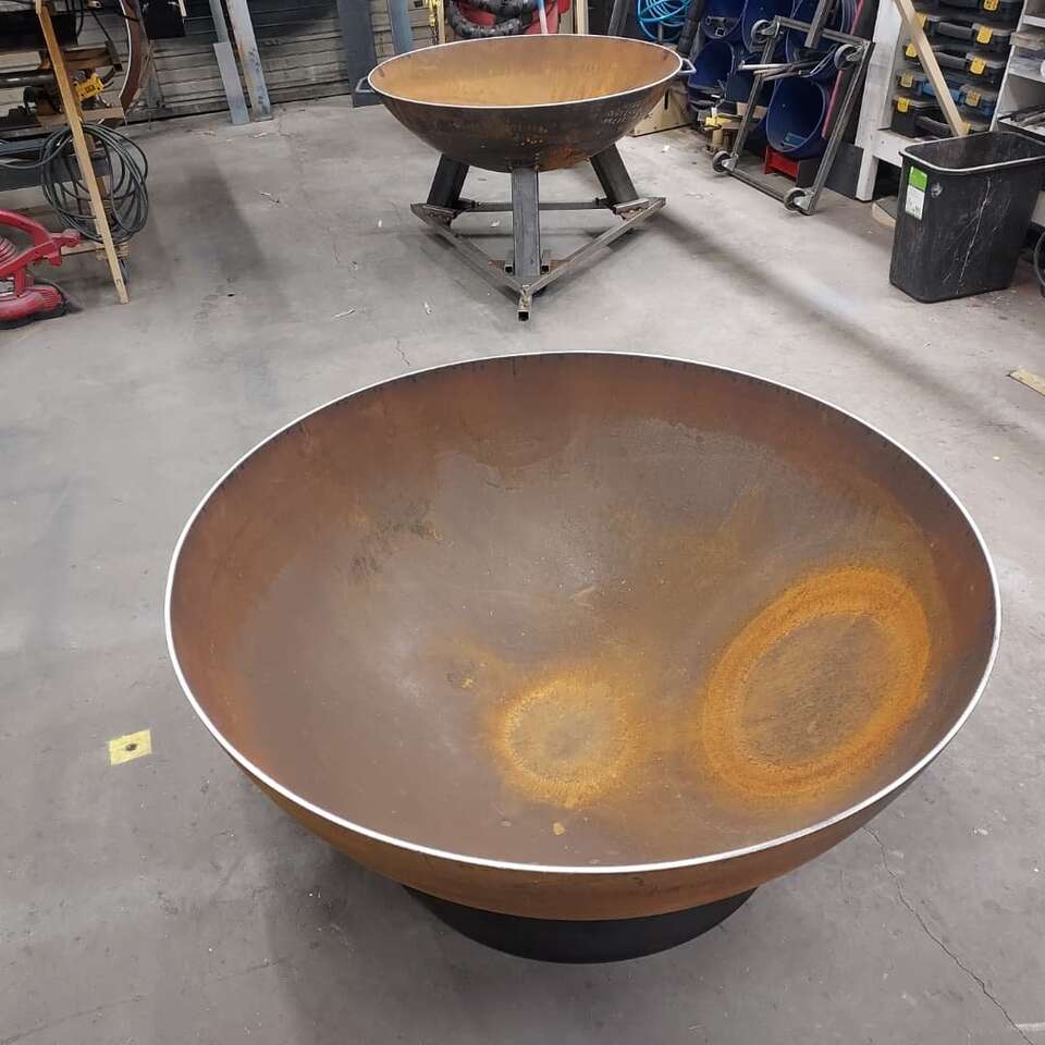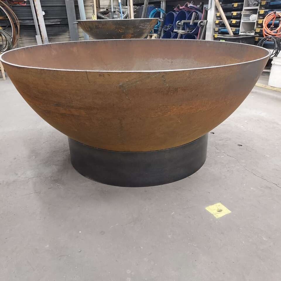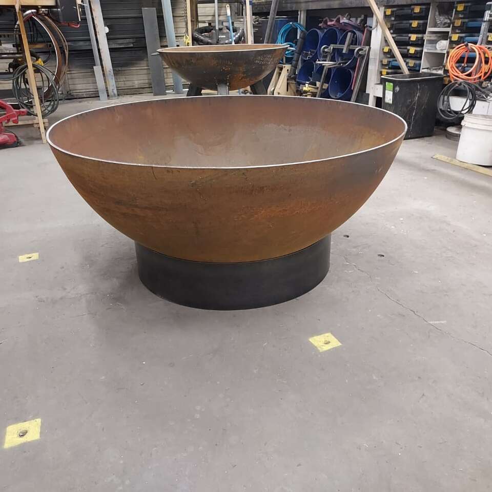 Fire bowls are heavy duty.Steel construction comes in thirty ,thirty six, and forty inch dia. has a six inch steel ring base comes with or without handles