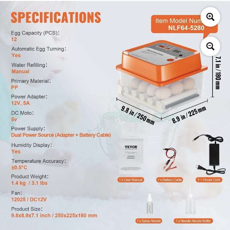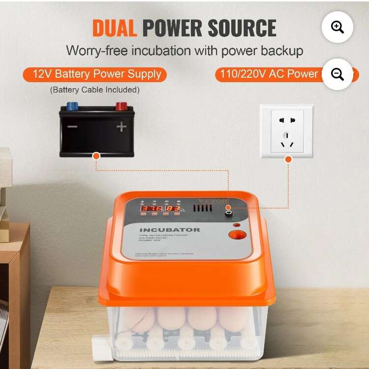DUAL POWER SOURCE Worry-free incubation allows Regular Plug In 110/220V AC Power Transfer To 12V Output Or 12V Battery Power Supply Can Power Backup Or Allow Transport In Vehicle.