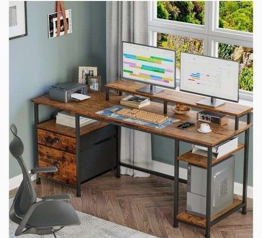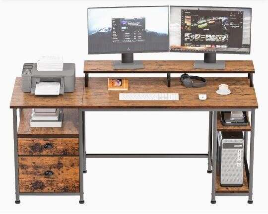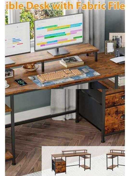 Retailer's Title: Furologee 61" Desk with Fabric File Drawer, Reversible Computer Desk with Shelves and Drawer, Industrial Writing Table with Monitor Stand, Long Study Table Workstation for Home Office, Rustic Brown