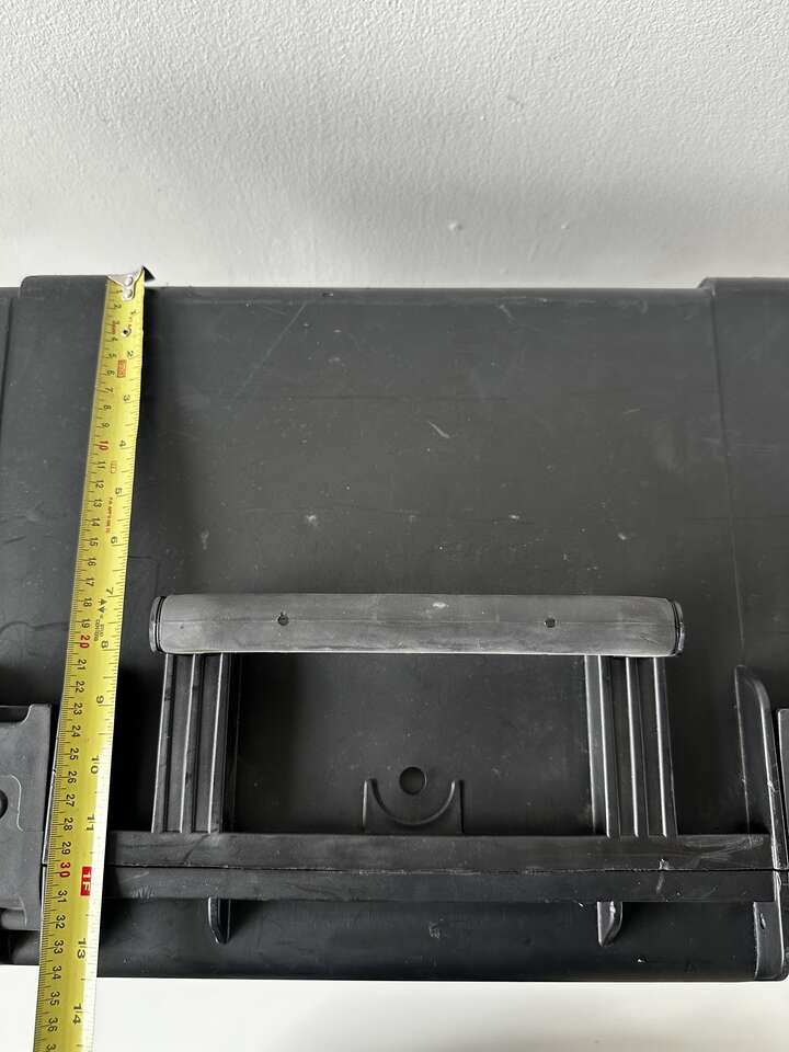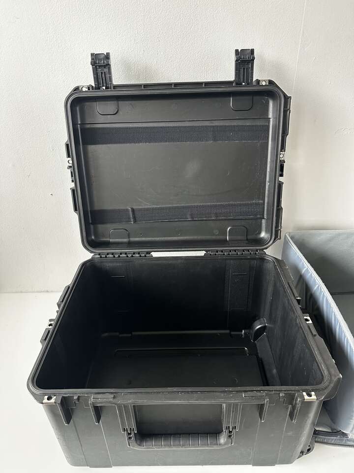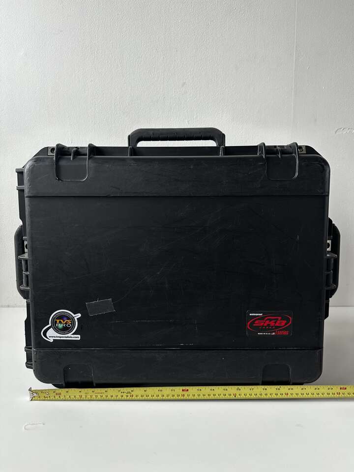 Watertight, dustproof, molded SKB iSeries 2015-10 Case with Think Tank outlinign & Lid Organizer. The black case features two trigger latches, two metal-reinforced locking loops for optional padlocks, an automatic ambient pressure-equalization valve, three over-sized handles and a trolley handle with wheels. Under the lid is an organizer with two zippered clear mesh pockets, a large zippered side pocket, and a polyester-lined iPad/laptop top-loading pocket. The lid organizer is attached with touch-fastening fabric.