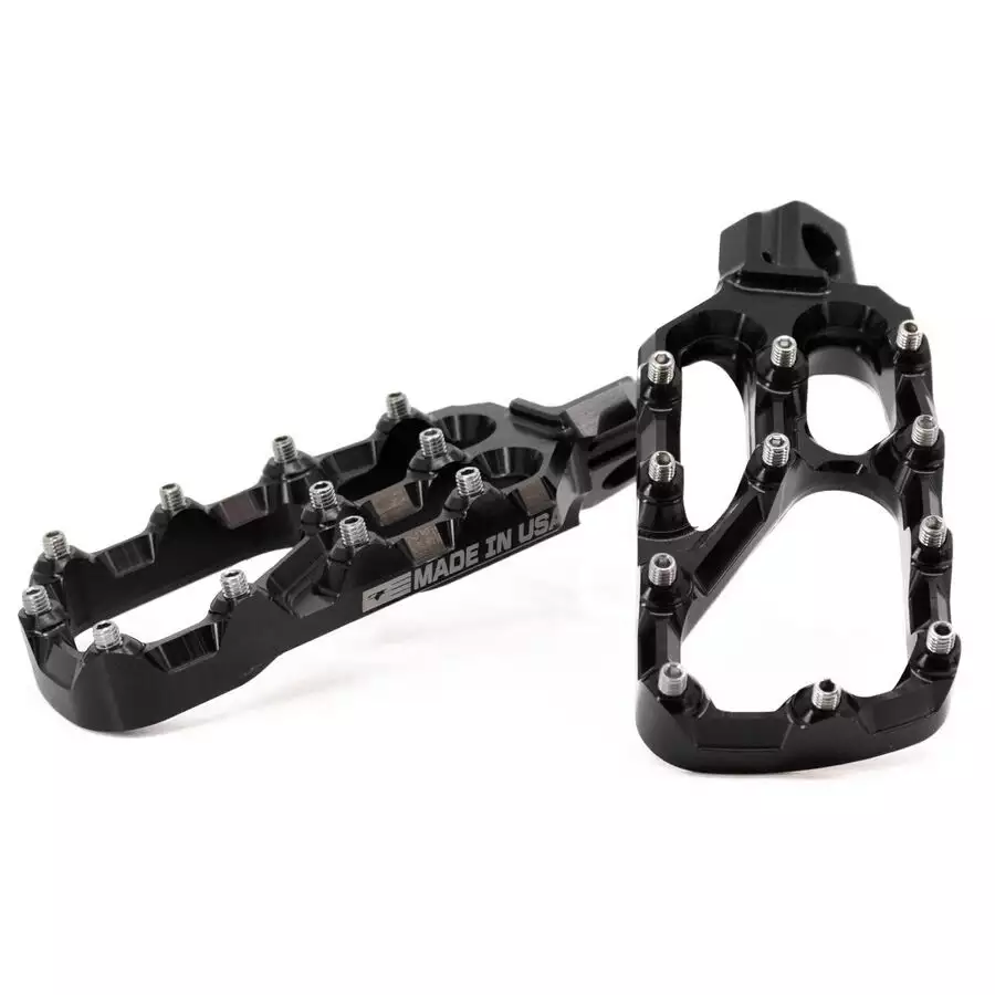 Fastway has integrated their top-tier foot peg technology into this design, ensuring durability and optimal performance. The angled design efficiently sheds mud and snow, keeping the pegs clear for consistent traction. With a platform size of 2.25" front to back and 4.75" wide, these pegs offer increased support—a 1.5-inch width increase compared to standard Evolution III pegs, making them the ideal choice for adventure and off-road riders.