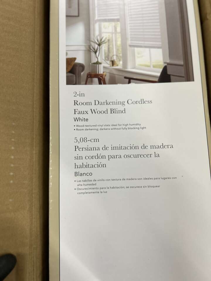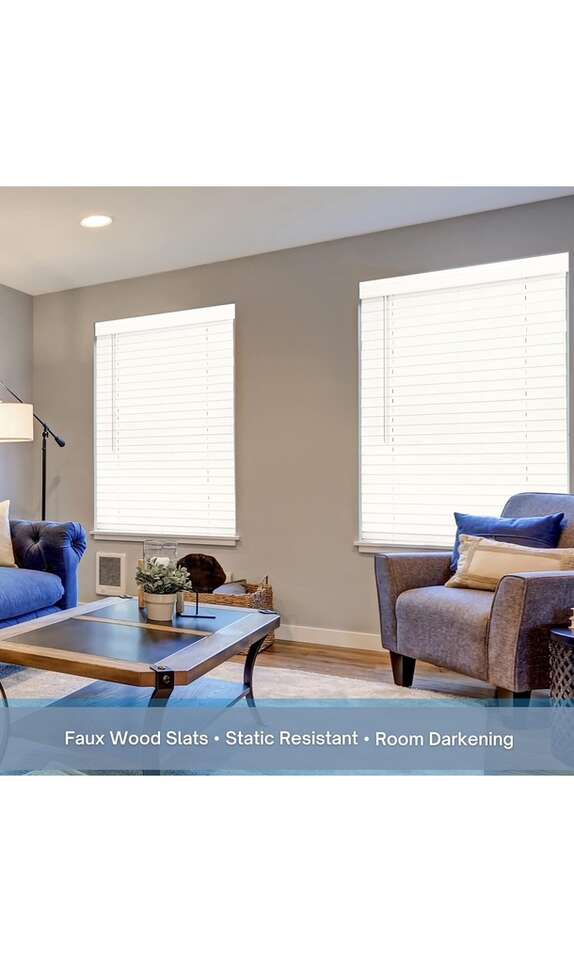 Features: 2-inch wood-textured vinyl slats – ideal for high humidity areas Cordless design for a clean look and child safety Room darkening – reduces light without fully blocking it Elegant white color to match various decor styles
