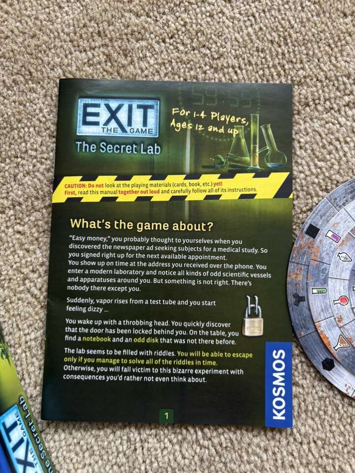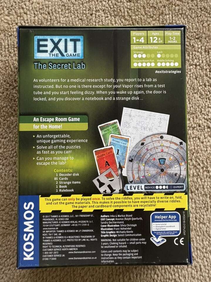 NEW (open box, sealed/unpunched components) EXIT: The Game--The Secret Lab. Can you solve the riddles to escape the laboratory? An escape game. By Kosmos, Inka & Markus Brand, 2017. 1-4 players, age 12+. New, unplayed condition. Text only. Cash or Venmo.