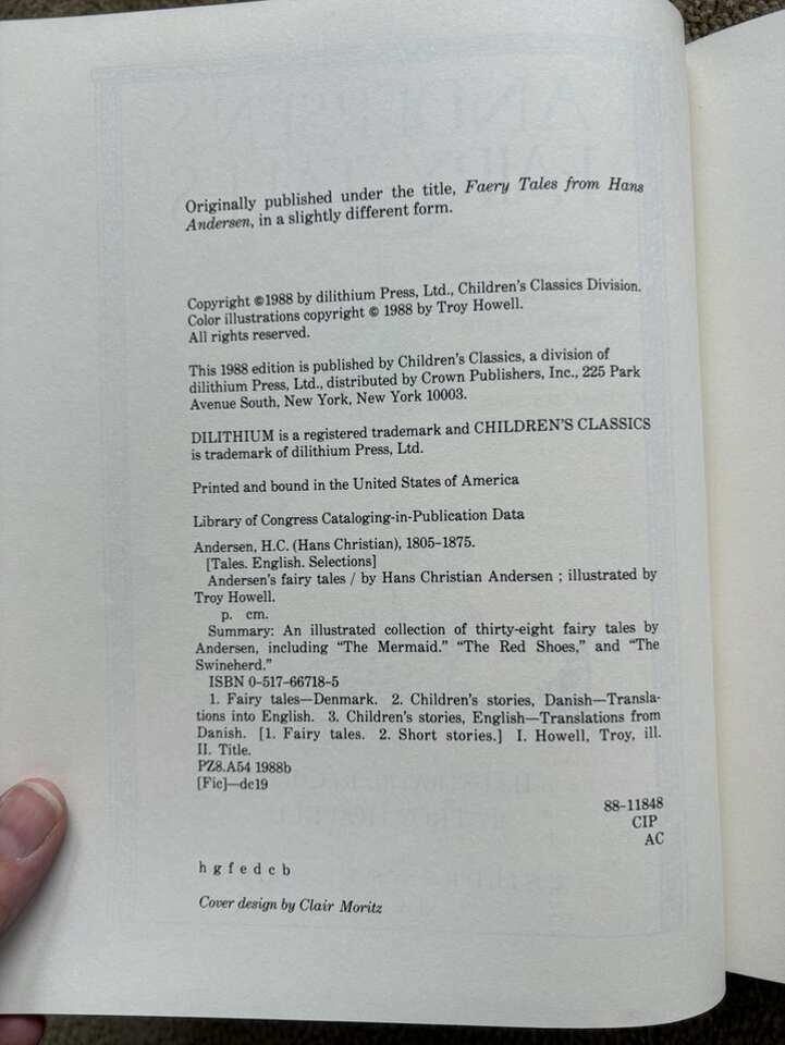 Fairy Tales, by Hans Christian Andersen, illustrated by Troy Howell. Children’s Classics Edition, 1988, 336 pages. Beautiful hardcover edition in excellent condition. Text only. Cash or Venmo.
