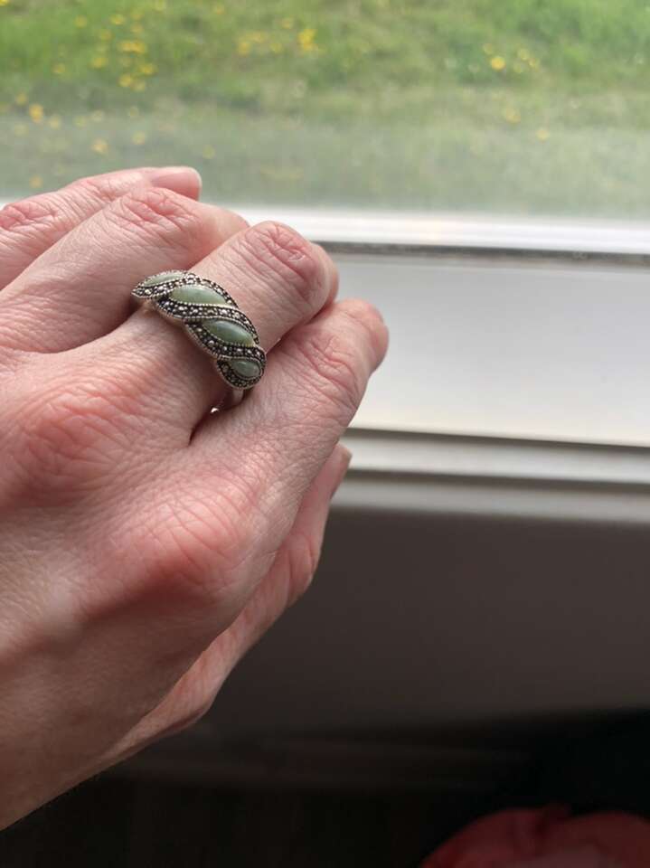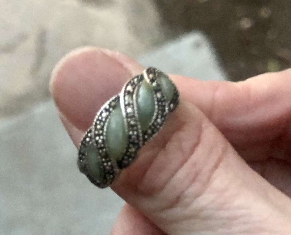 925 Sterling Silver Green Jade & Marcasite Band Ring