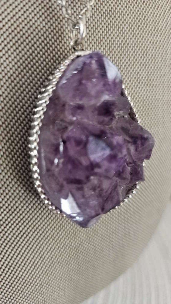 Absolutely beautifully natural colored, vintage (1.75 inches large), Amethyst Geode Pendant Comes with an adjustable 24" lobster claw chain for easy on-off and conveniently adjusts from a short choker length clear up to 24", or anywhere in between. It is so well done with light and dark purples that shimmer in the light and has a very smooth-cut, flat, snagfree back.