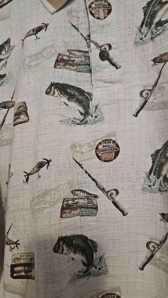 VenmoAmerican Summer Clothing Company Mens Bass Fishing themed polo shirt size Large 100% Cotton No rips, tears, snags, or stains.