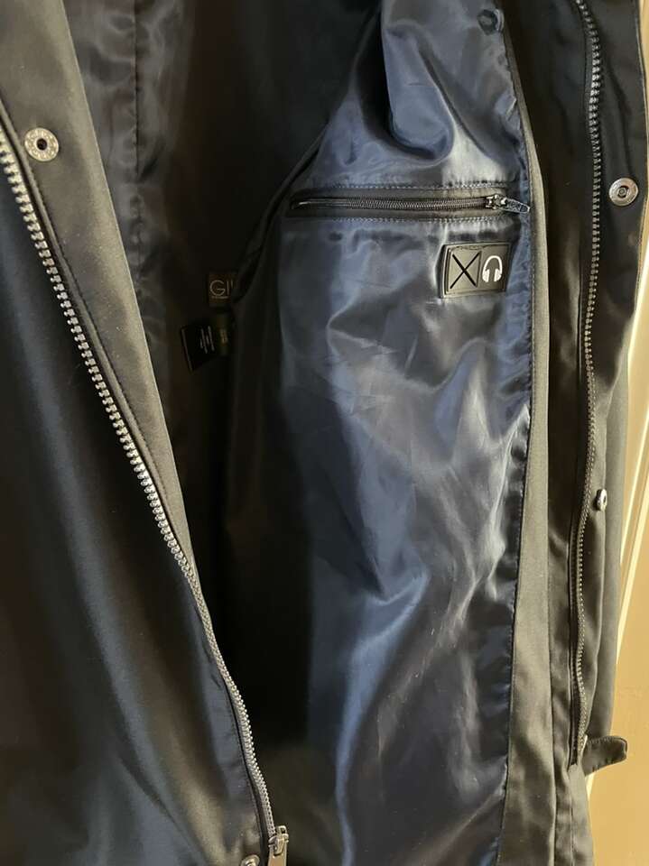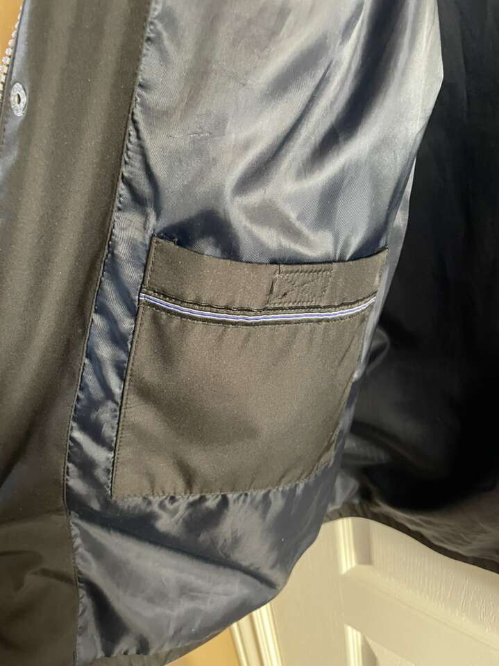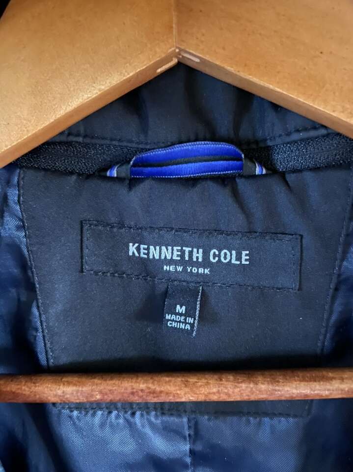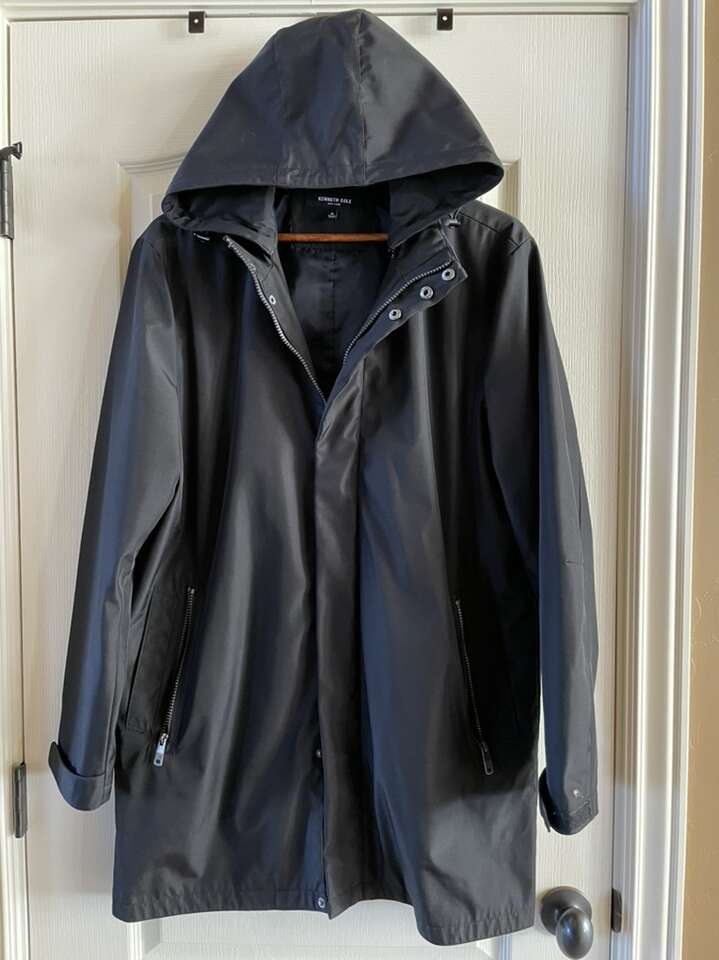PayPalMid length Modern Trench Coat Rain Wind Jacket by Kenneth Cole New York with liner & hood, medium length, 2 hidden pockets inside, 2 double pockets on each side of the front with zipper closures for security, in black, size medium for men.