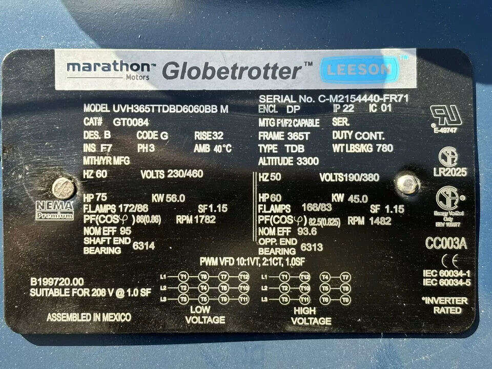 PayPalMarathon Globetrotter Leeson General Purpose Motor 75HP 1782RPM 365T DP 3PH GT0084 365TTDBD6060