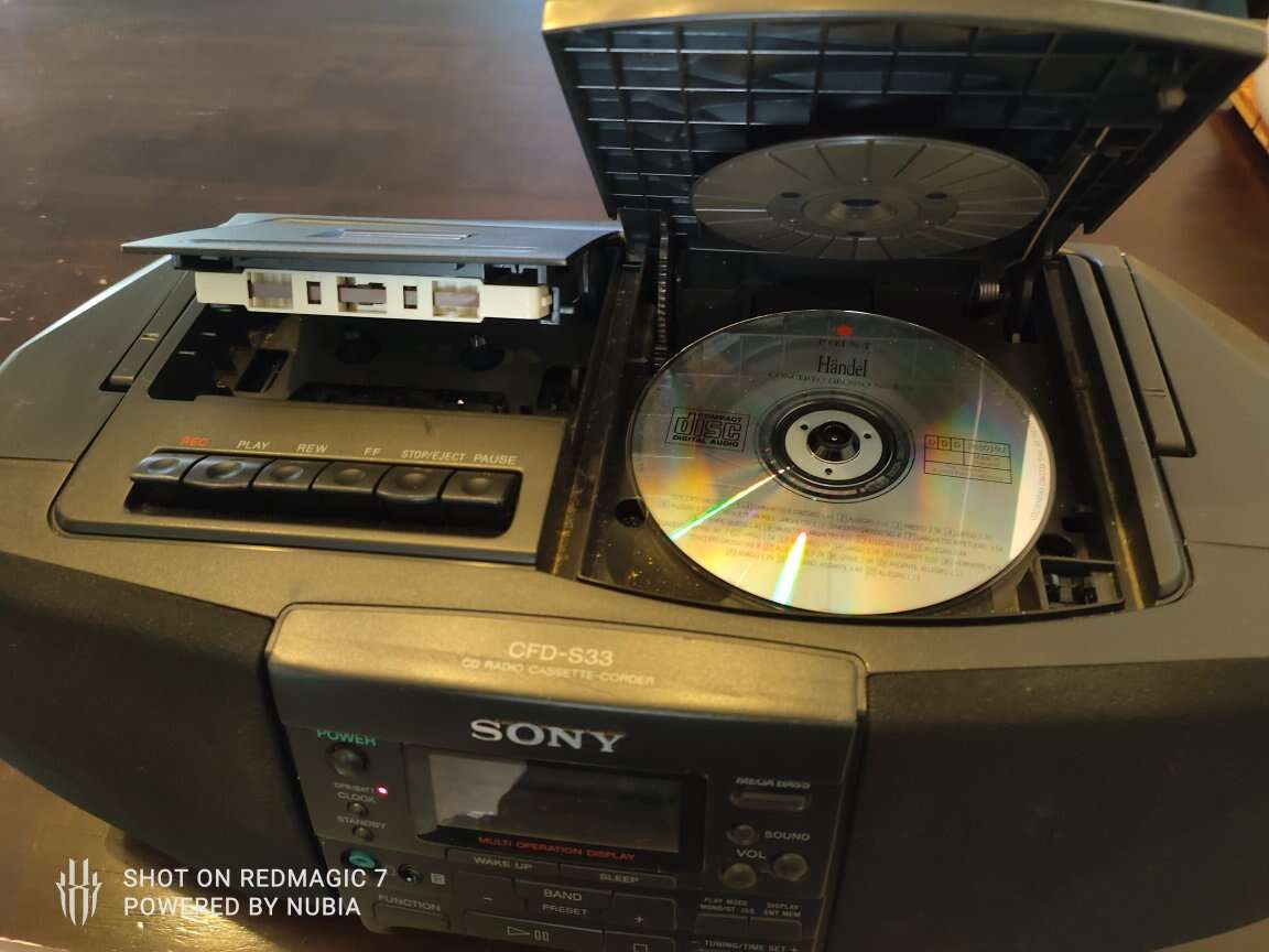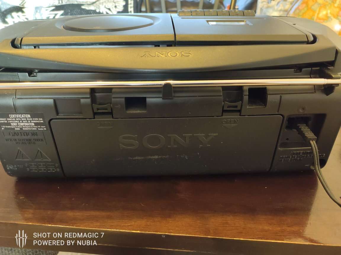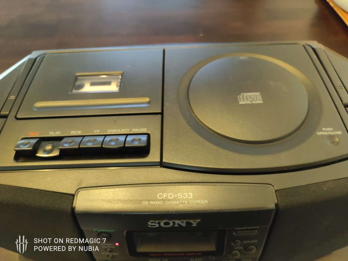 in amazing condition and shape vintage Sony CFD-S33 CD Tape AM/FM Radio Cassette Recorder Mega Bass Boombox. radios works tape mechanism works fine but sound sometimes makes a little pause. no remote.