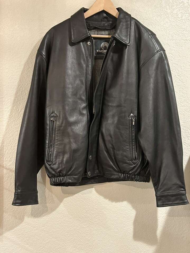 Mens “Weatherproof” Leather Jacket. Well constructed leather, with zip out liner. Leather is in good condition with slight wear on cuffs.
