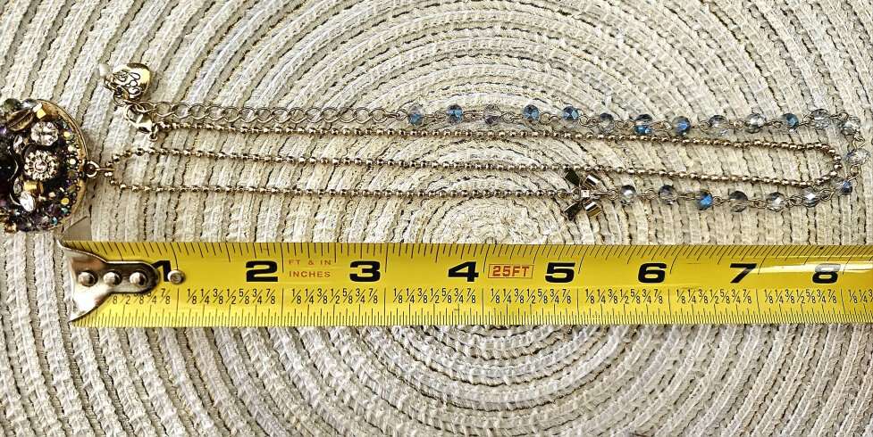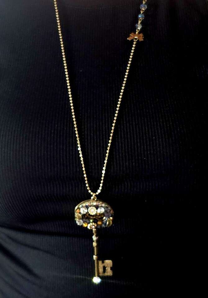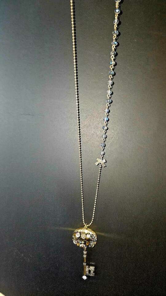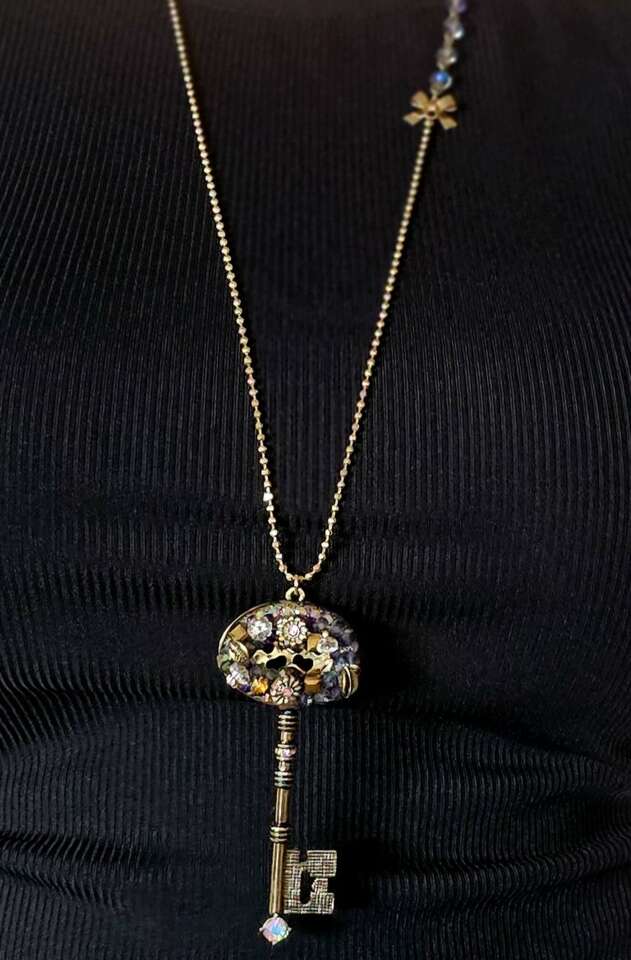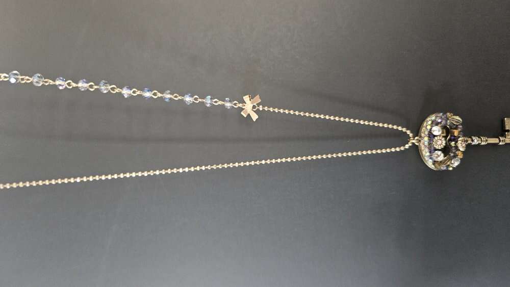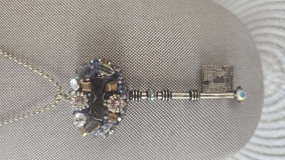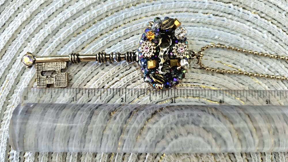 Beautiful vintage Betsy Johnson Skelton key necklace. So detailed with light lavender, pinks, and Aurora Boreallis border and side embelishments crystals. Skelton key measures 3" X 1.5" and the chain is 32" Long and is adjustable. This is older but in great condition.