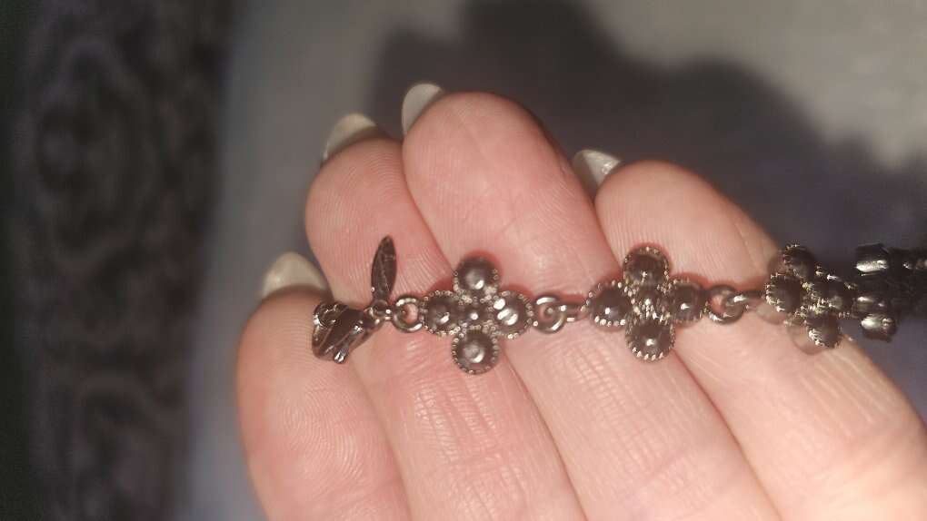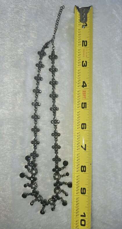 Vintage AVON Gun Metal Grey daisy shaped florets with 13 black dangling rhinestones and 7 additional black florets to match. This color combination makes this piece so versatile and easy to wear. Measures 20", including a 2" extension. and easy-to-close lobster claw.