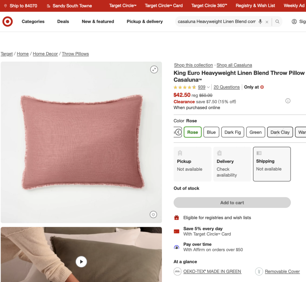 This set is just beautiful! The color is rose and it comes with a king size comforter, 2 pillow shams and an extra large throw pillow. I got this on clearance at Target and paid $165 after tax. Prior to going on clearance, it was $159 for the comforter set and $50 for the large throw pillow, over $200 for all. This rose color is now sold out. I just have too many comforter sets and I don't change them out much and I'm running out of closet space. This set has never been used or even opened. The rose color is soft and calming and it's so soft! The back side of the comforter is cotton sateen. I've had it for too long and I'm not able to return it now.