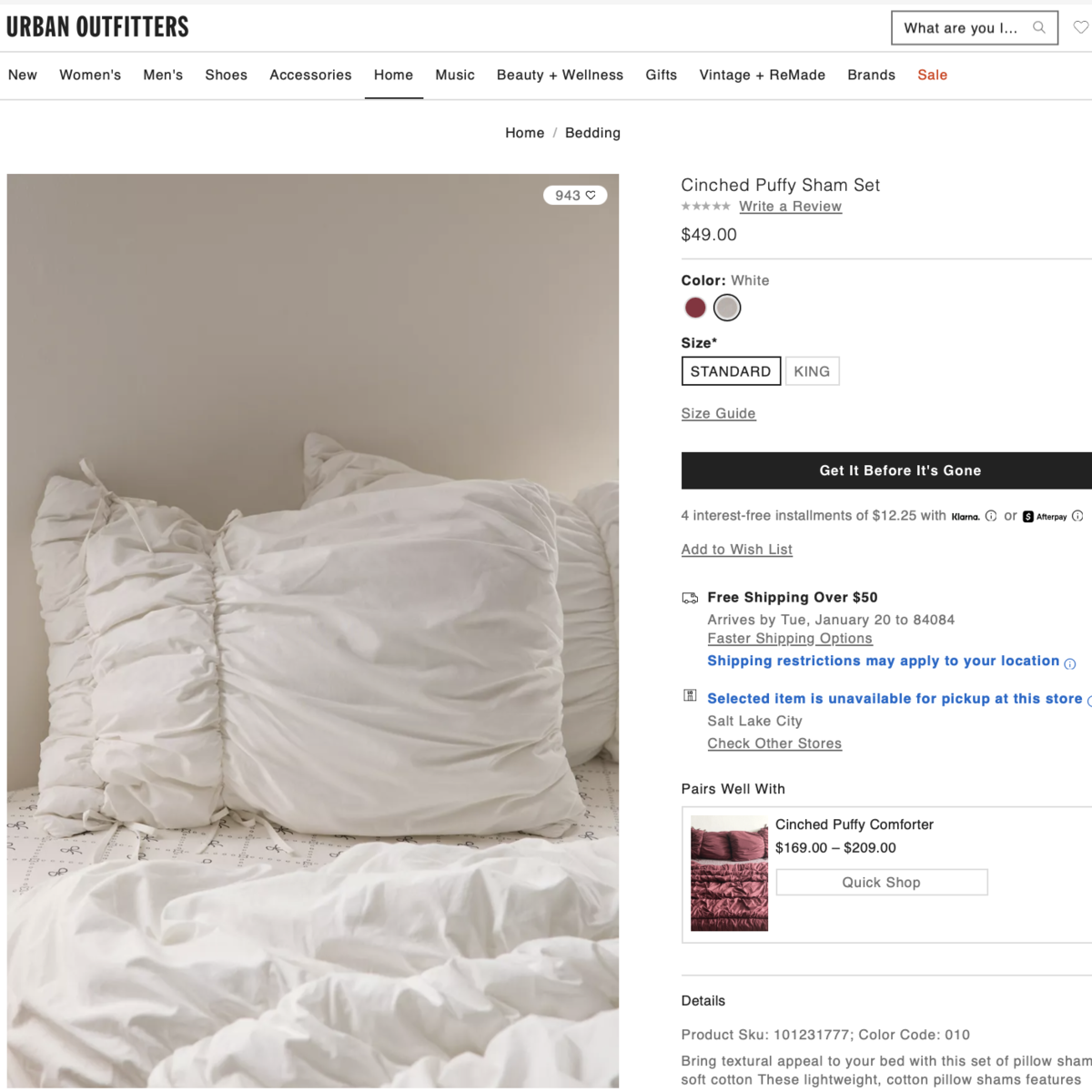 The comforter is no longer available and was $269 new. I got it on clearance for $181.25 (that's with tax). I bought the pillow shams for $52.55 (that's with tax) on the UO website. So I ended up paying $233.80 for everthing.