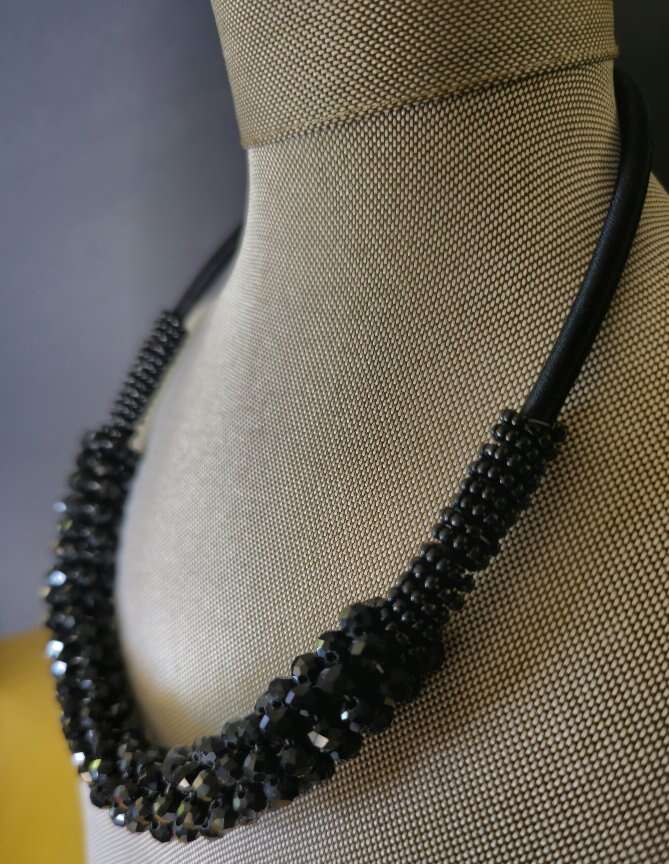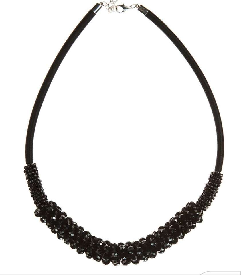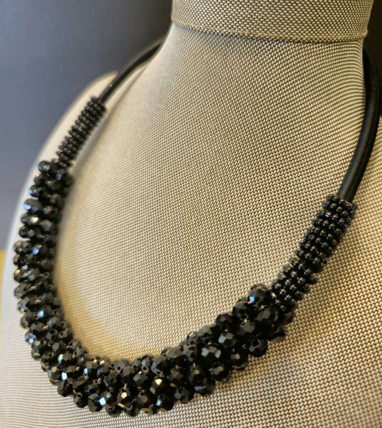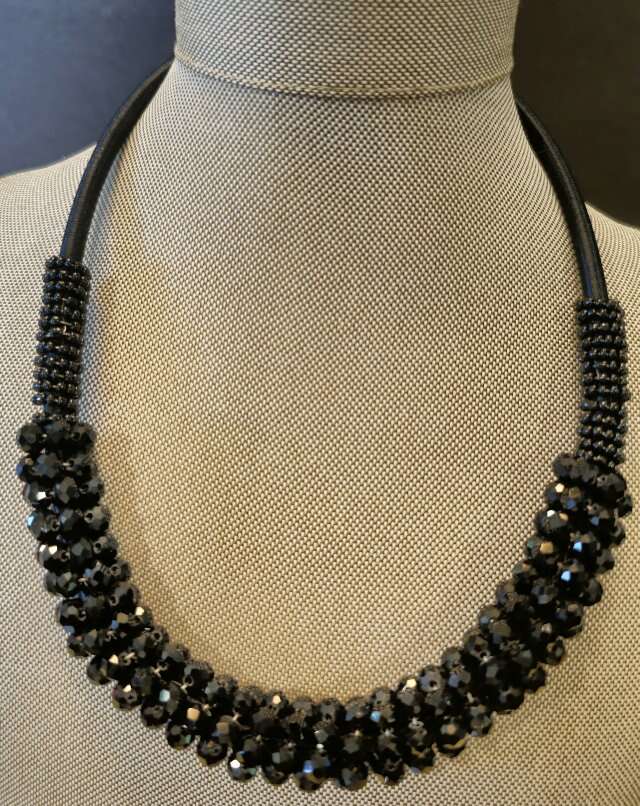 Elegant & glamorous black vintage Kalinda cluster beaded/rhinestone necklace. The light really reflects off the rhinestones and the necklace is in great shape. 20" length Includes a 3" adjustable silver lobster claw closure.