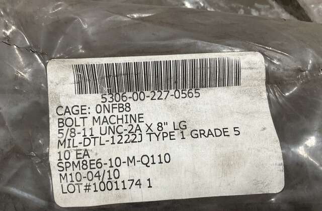 FASTENER LENGTH (AASB) 7.750 INCHES MINIMUM AND 8.000 INCHES MAXIMUM FEATURES PROVIDED (CBBL) FINISHED HEAD GRIP LENGTH (ANEE) 6.188 INCHES NOMINAL HARDNESS RATING (CQFM) 23.0 ROCKWELL C MINIMUM AND 32.0 ROCKWELL C MAXIMUM OVERALL HEAD HEIGHT (AASU) 0.378 INCHES MINIMUM AND 0.403 INCHES MAXIMUM HEAD STYLE (AASK) HEXAGON MATERIAL DOCUMENT AND CLASSIFICATION (MDCL) SAE GR 5 ASSN STD SINGLE MATERIAL RESPONSE OVERALL MATERIAL (MATT) STEEL OVERALL MINIMUM TENSILE STRENGTH (CQBC) 120000 POUNDS PER SQUARE INCH NOMINAL THREAD DIAMETER (AHYM) 0.625 INCHES NONDEFINITIVE SPEC/STD DATA (ZZZT) 1 TYPE AND 5 GRADE WIDTH BETWEEN FLATS (AATB) 0.906 INCHES MINIMUM AND 0.937 INCHES MAXIMUM THREAD CLASS (AAJD) 2A THREAD DIRECTION (AAJF) RIGHT-HAND THREAD LENGTH (AASA) 1.812 INCHES MINIMUM THREAD SERIES DESIGNATOR (THSD) UNC THREAD QUANTITY PER INCH (CMLP) 11 UNABLE TO DECODE (AASK) UNABLE TO DECODE