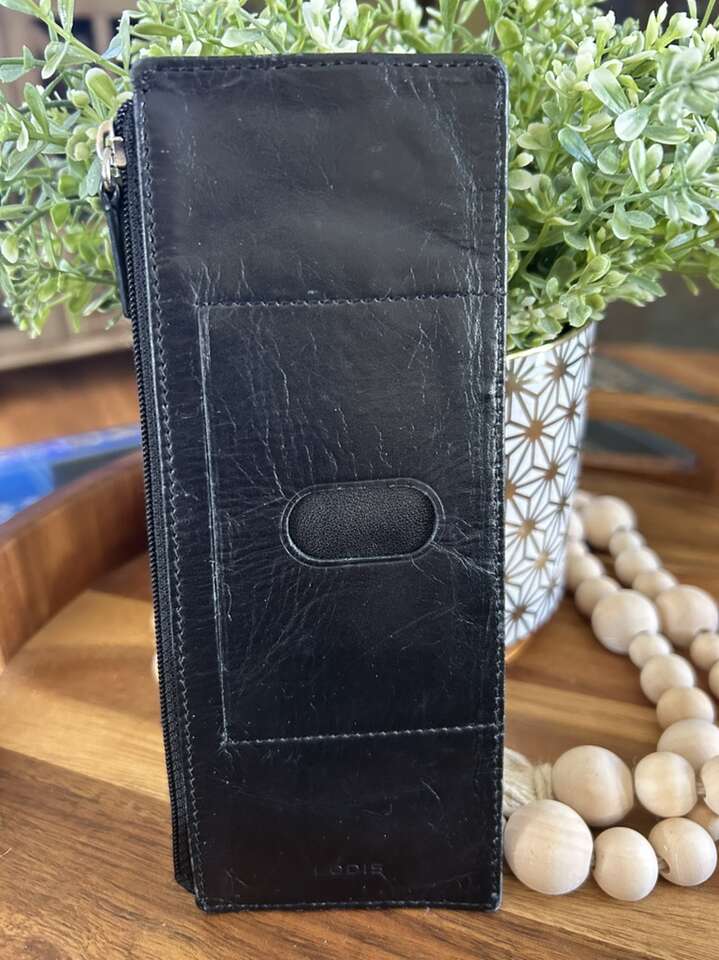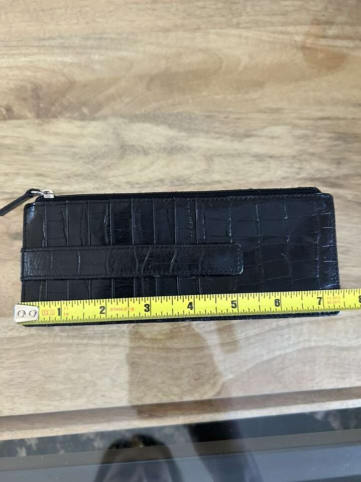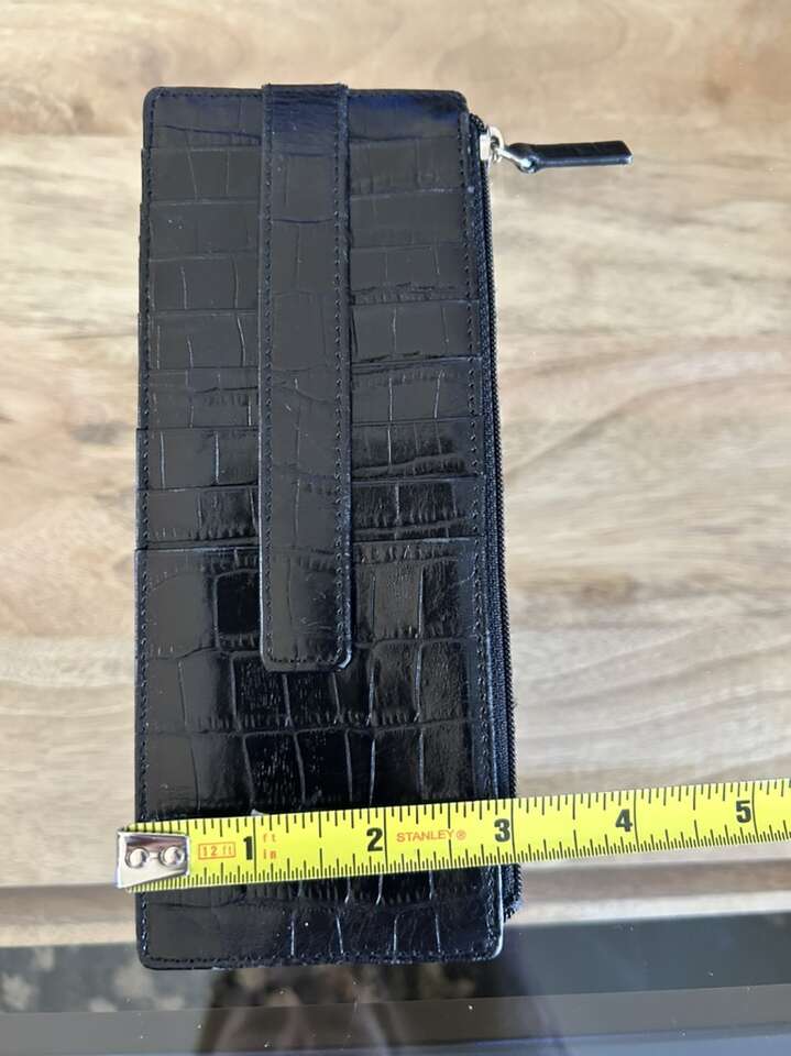 VenmoSleek and streamlined Lodia black leather credit card wallet. Soft buttery smooth black leather on one side and croc embossed on the other. ID slot on one side. Top zipper pouch. Eight card slots with secure snap strap closure. Silver hardware on the zipper. No stains flaws or defects. Clean smoke free home. Cash or Venmo.