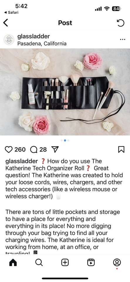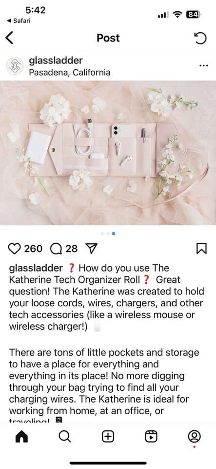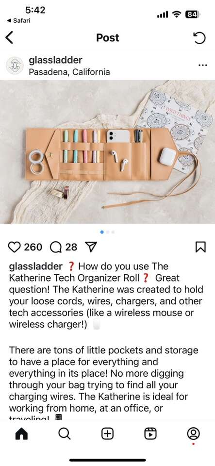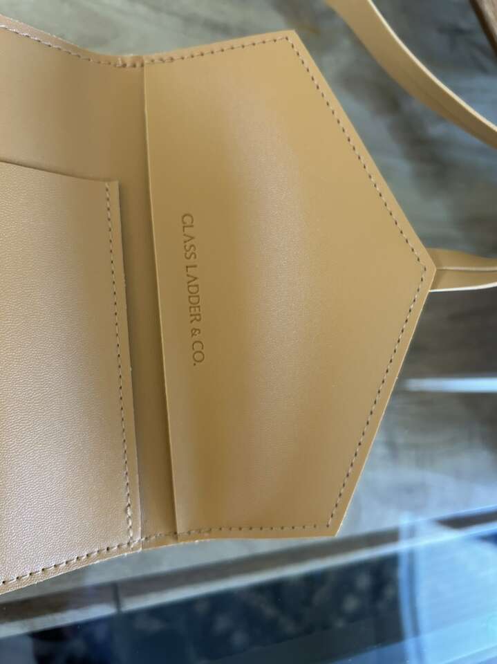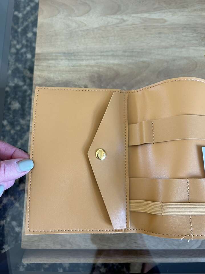VenmoNew from the Glass Ladder Company faux leather Katherine Tech Organizer roll up pouch. Perfect for containing and keeping everything in one place safe and sound. Excellent for travel. Sleek and very sophisticated. Clean simple. Smoke free home. Perfect for a gift. Gold tone metal end caps. Lots of ways to configure your belongings. Multiple uses. Cleans easily with the wipe of a soft cloth. Lays flat so you can see everything at once. Beautiful tan fawn color. Cash or Venmo. Porch pickup from Alpine.