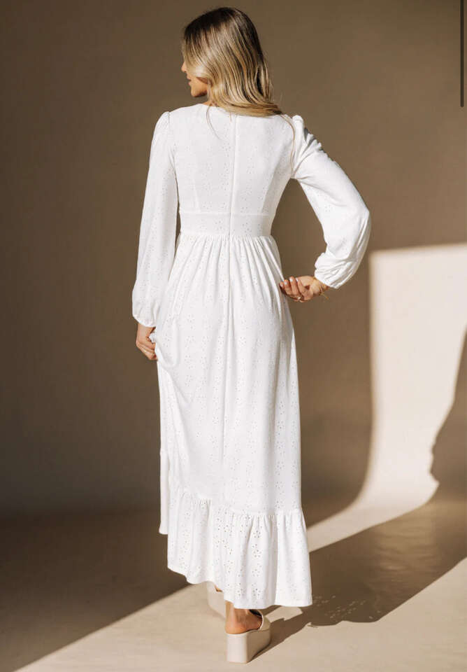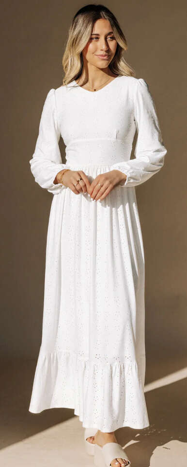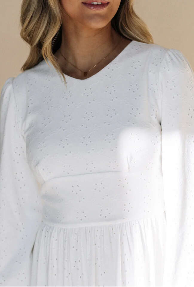 ApplePayIndulge in the luxurious elegance of the Sandra Temple Gown. This maxi length dress features a stunning floral eyelet pattern with a zipper in back and pockets on each side. The flattering waist adds an extra touch of sophistication, making this temple dress the perfect choice for your attendance. This temple dress boasts one of our softest fabrics. If comfort is what you're going for, look no further!