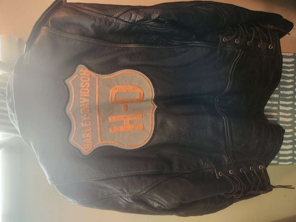 leather jacket in great condition Harley Davidson patch on back Size 44 the Brand is Bikers club Asking $75 text only!