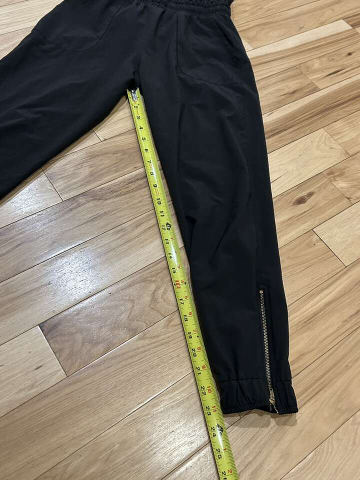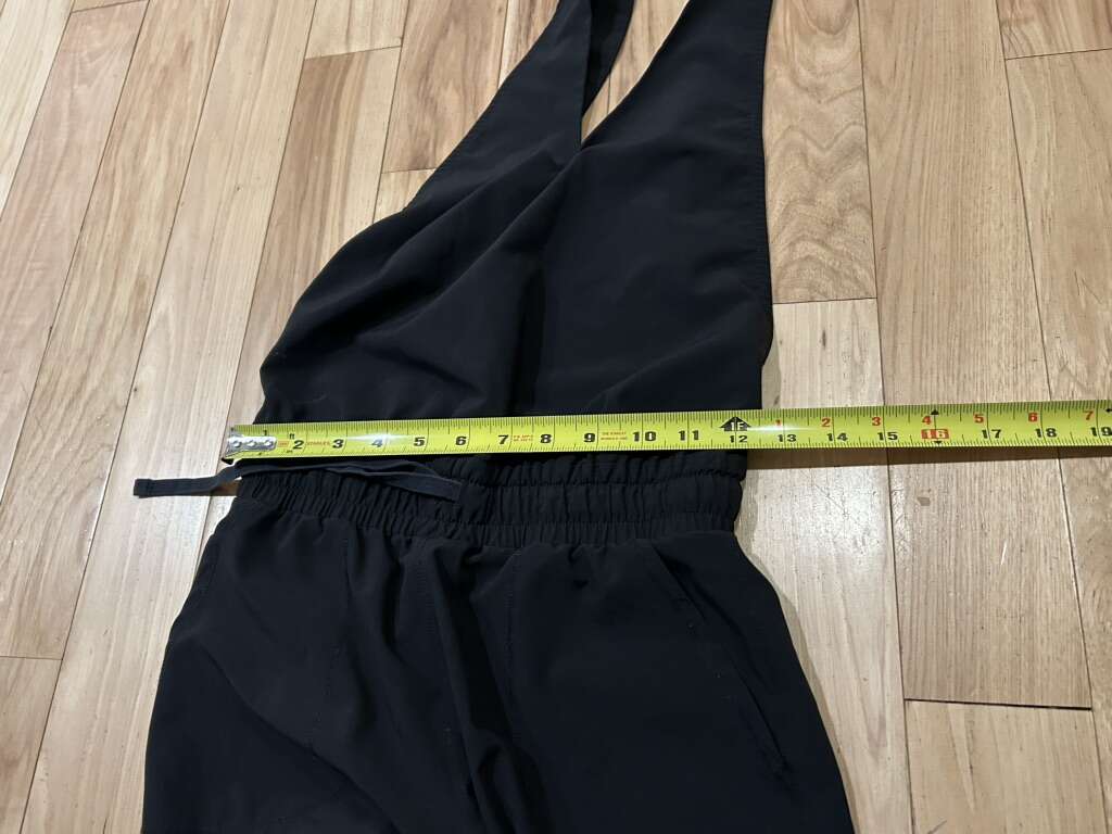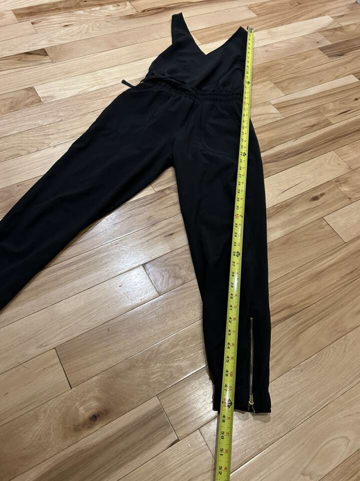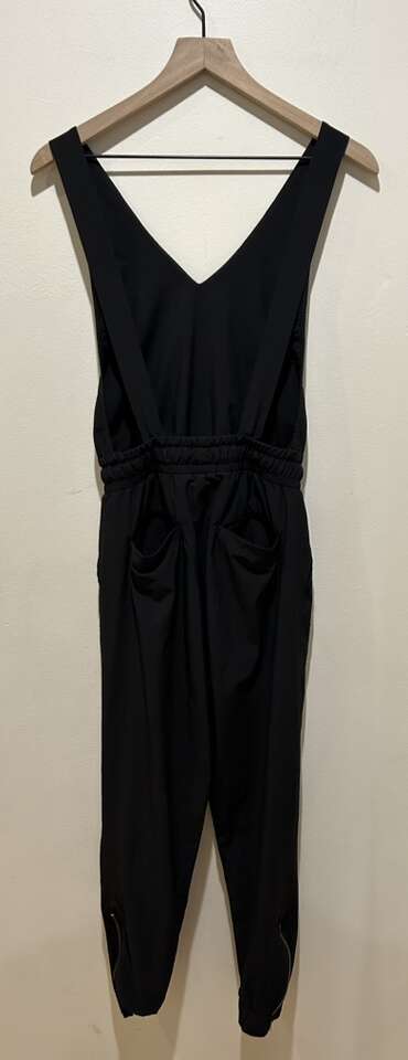 Albion Fit Black V-Neck Pants Jumpsuit - Women’s Size XXS - with adjustable straps for flexible fit, pockets, gold zippers at the ankles, open back and waist drawstrings - lightweight and breathable - pre-owned, great condition. C074