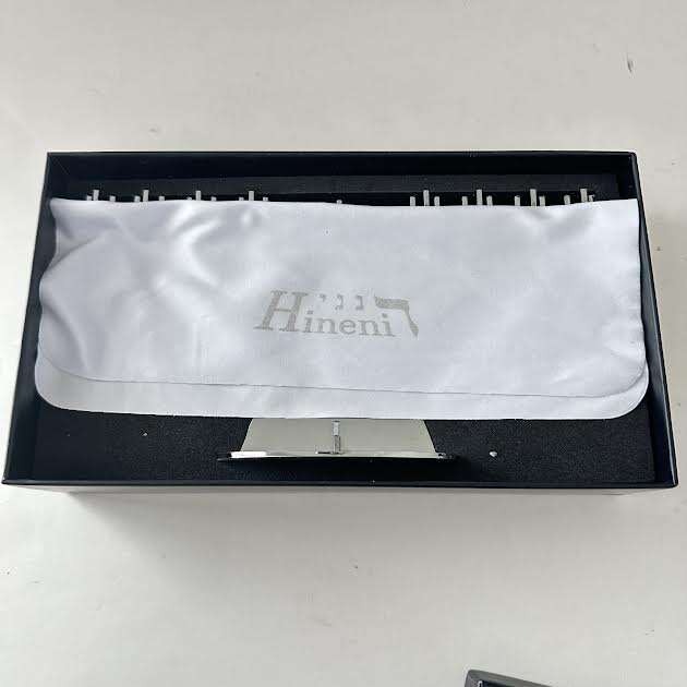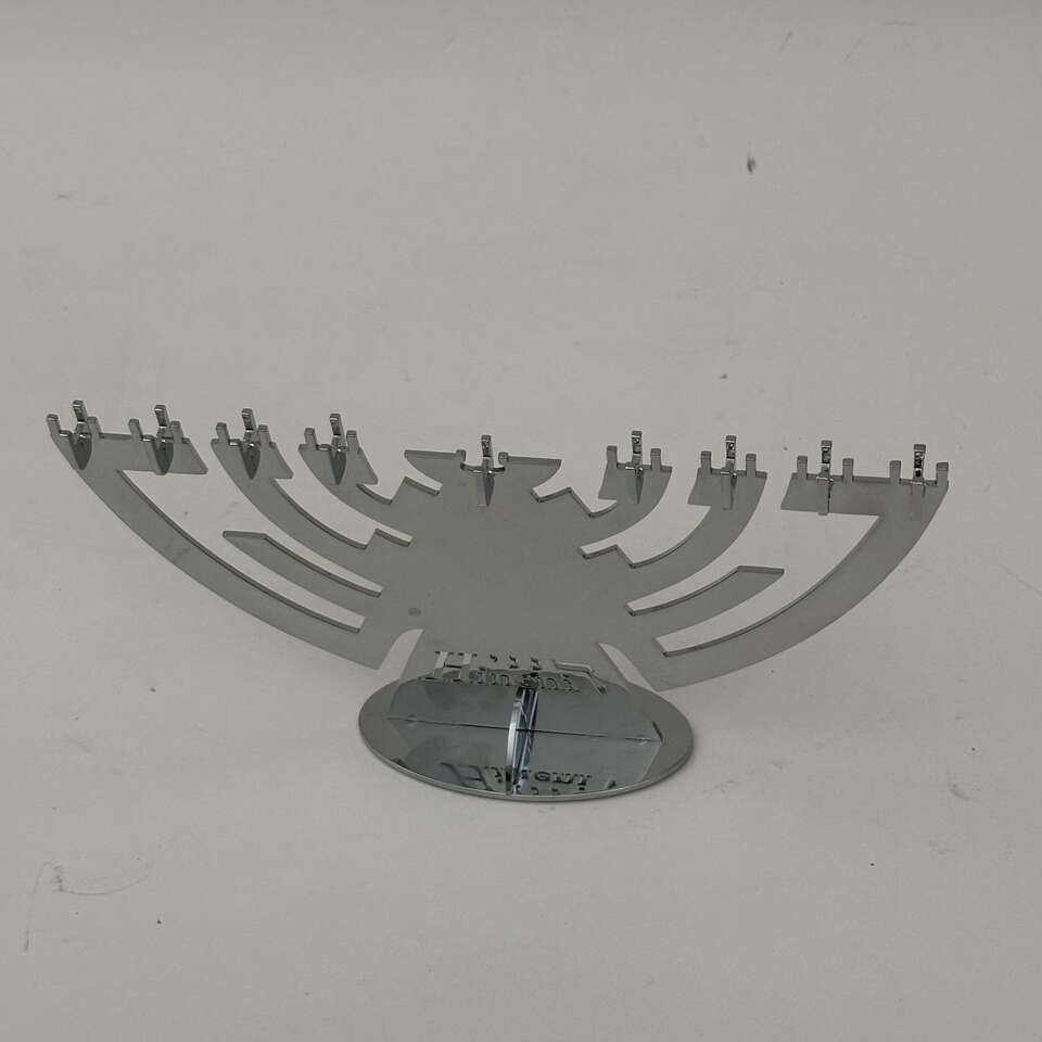 VenmoHineni silver chrome menorah. Contemporary design. Shiny reflective surface. New. Stands on 3.5” oval base. Size 8” x 4”. Weight 8.3 oz. Set in black felt lined box.