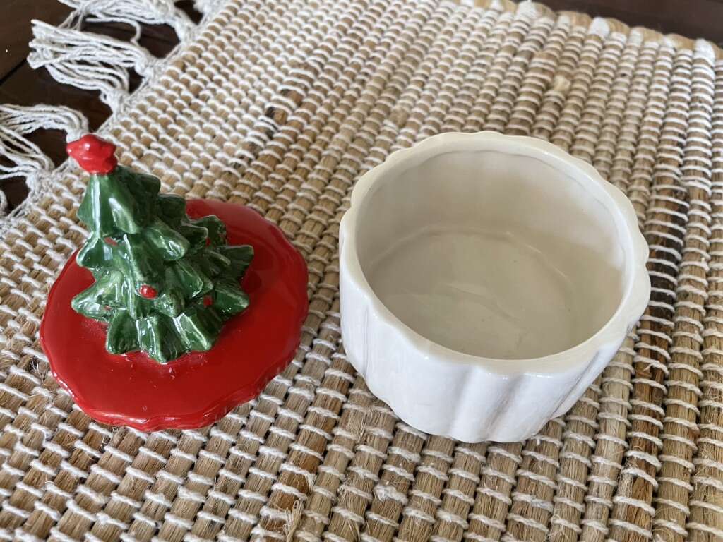 I have a little lidded trinket dish. It is white ceramic with a red lid with a Christmas tree on it. It is 5 inches tall and 3 1/4 inches across. See my other ads for jewelry, artwork, home decor and more.