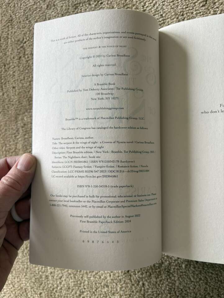 The Serpent of the Wings of Night, by Carissa Broadbent. Book 1 of the Nightborn Duet. A Crowns of Nyaxia novel. Bramble, Tor, 2022, 461 pages. Paperback in excellent condition, like new. Text only. Cash or Venmo.