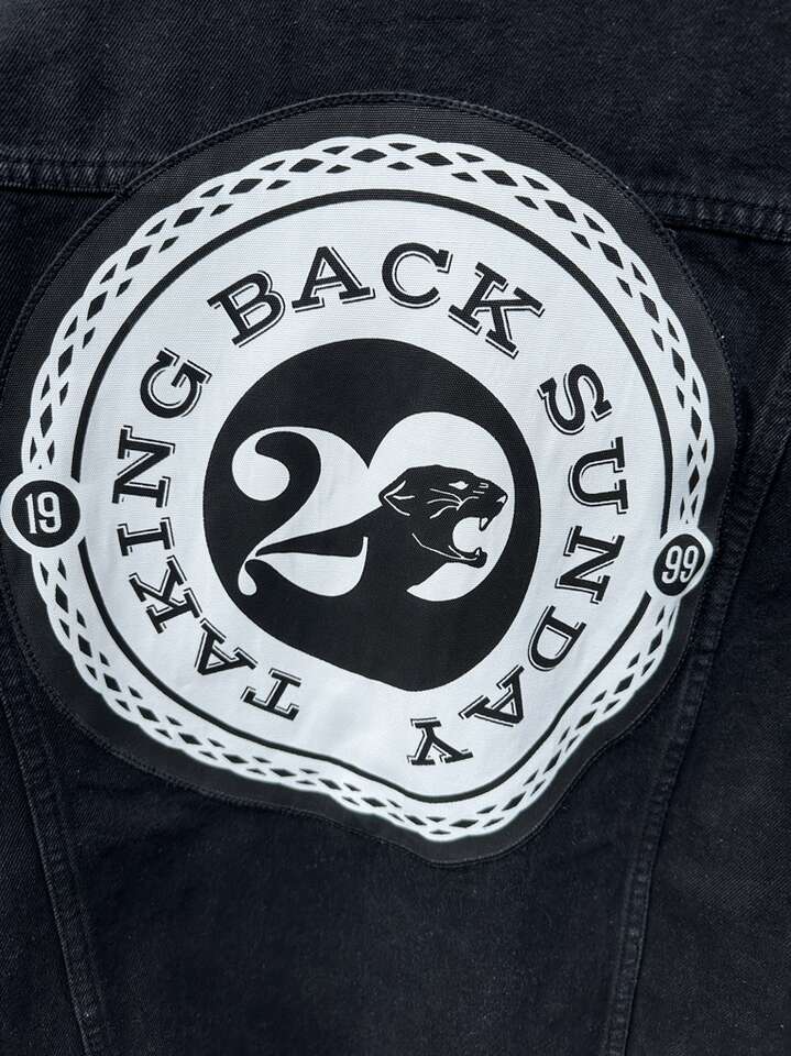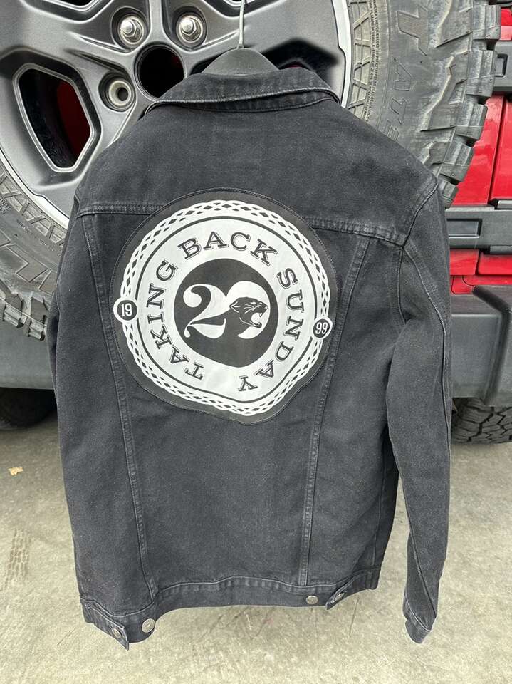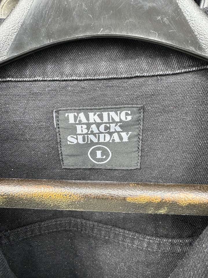 VenmoTaking Back Sunday black denim jacket. Really classic look. Has 29 with a panther in the logo. Also shows 19 on one side and 99 on the other. Denim is back baby!