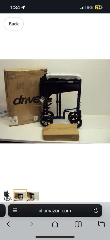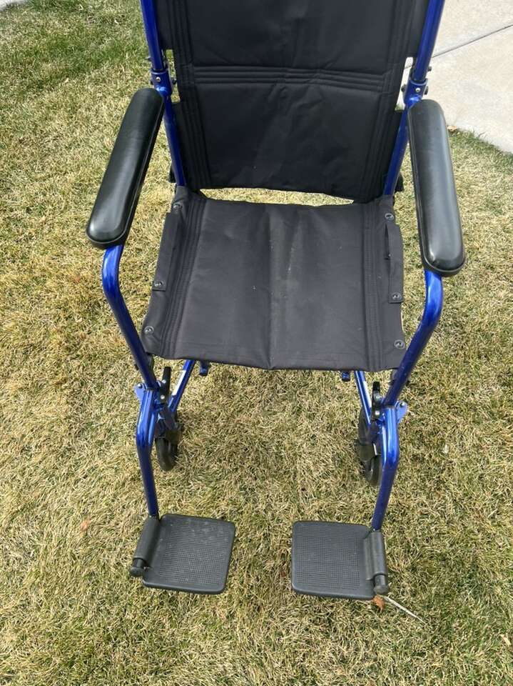 Drive lightweight foldable Transport chair with foot pedals, and seatbelt very lightweight folds up into a small square to fit in large luggage or car SUV, the seat is 19 inches wide