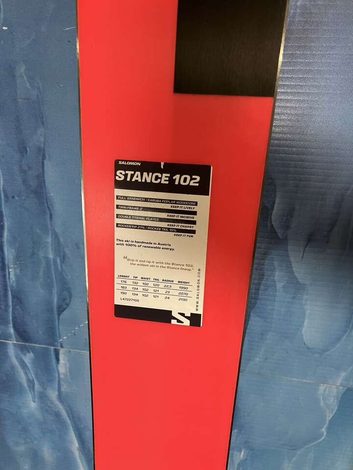 Size: 182cm Underfoot: 102mm The Stance 102 is your quintessential hotdogging, go-anywhere ski. Built for 100+ days on the mountain, the 102 features an updated karuba/polar core, full sandwich sidewall, and two redesigned titanal plates that when combined, create a lively, yet powerful ski that rips highspeed groomers and powers through crud. Turn up the tunes, it’s about to get rowdy under the chair. Base Condition: Excellent - An excellent base shows almost no signs of wear and tear on the ski's base or edges. Top Sheet Condition: Excellent - An Excellent Top Sheet shows almost no signs of wear and tear with no chips and only a handful of very small scratches or scuffs. This binding has been tested and passed by a certified technician please bring your boots. AJ Motion Sports Aspen Plaza 867 East 9400 South, Sandy 84094