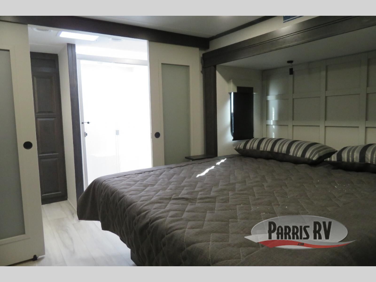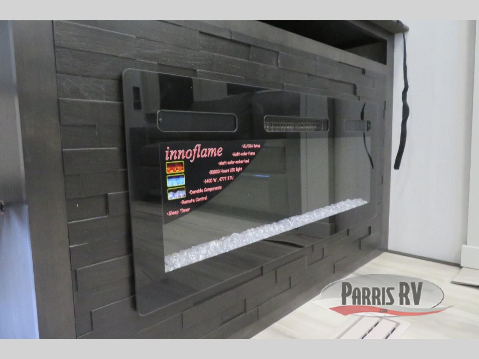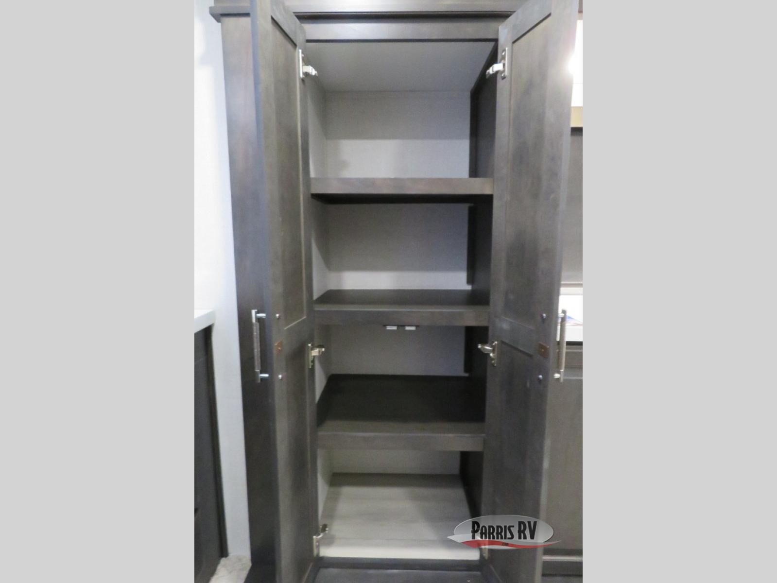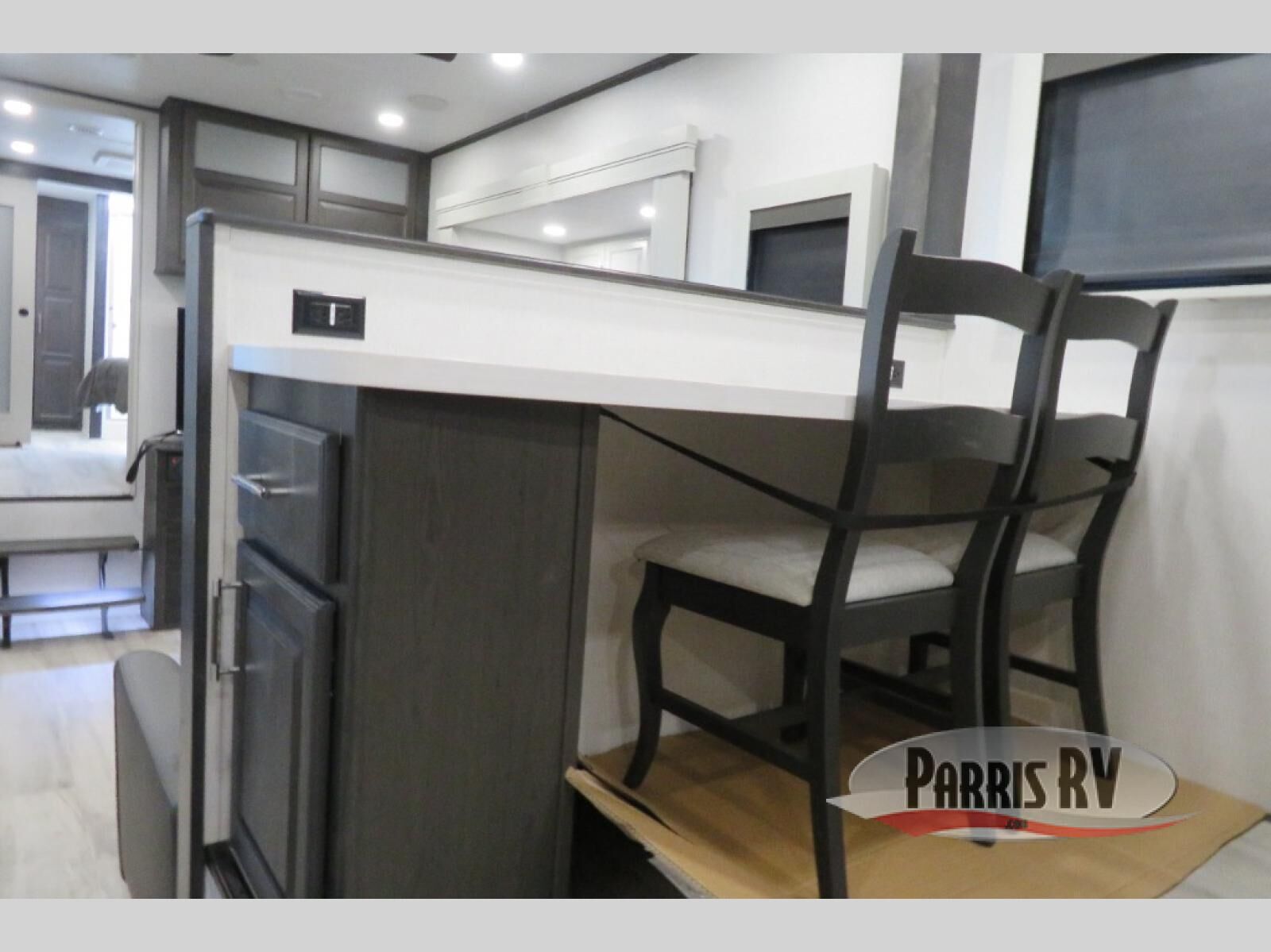 This fifth wheel is decked out in luxuries! The full rear bathroom has a walk-in shower to freshen up in each morning, a dual sink vanity for two to get ready at once, plus washer and dryer prep. You will enjoy a good night's rest on the king bed slide inside the private bedroom and others can sleep on the opposing tri-fold sofa sleeper slides in the living room. There is also a theater seating here, along with a fireplace and 50" LED TV for movie nights. The front kitchen is where it's really at in this fifth wheel; ample counter space, a bar top with stools, pull-out drawers, plus a pantry and closet for even more storage!