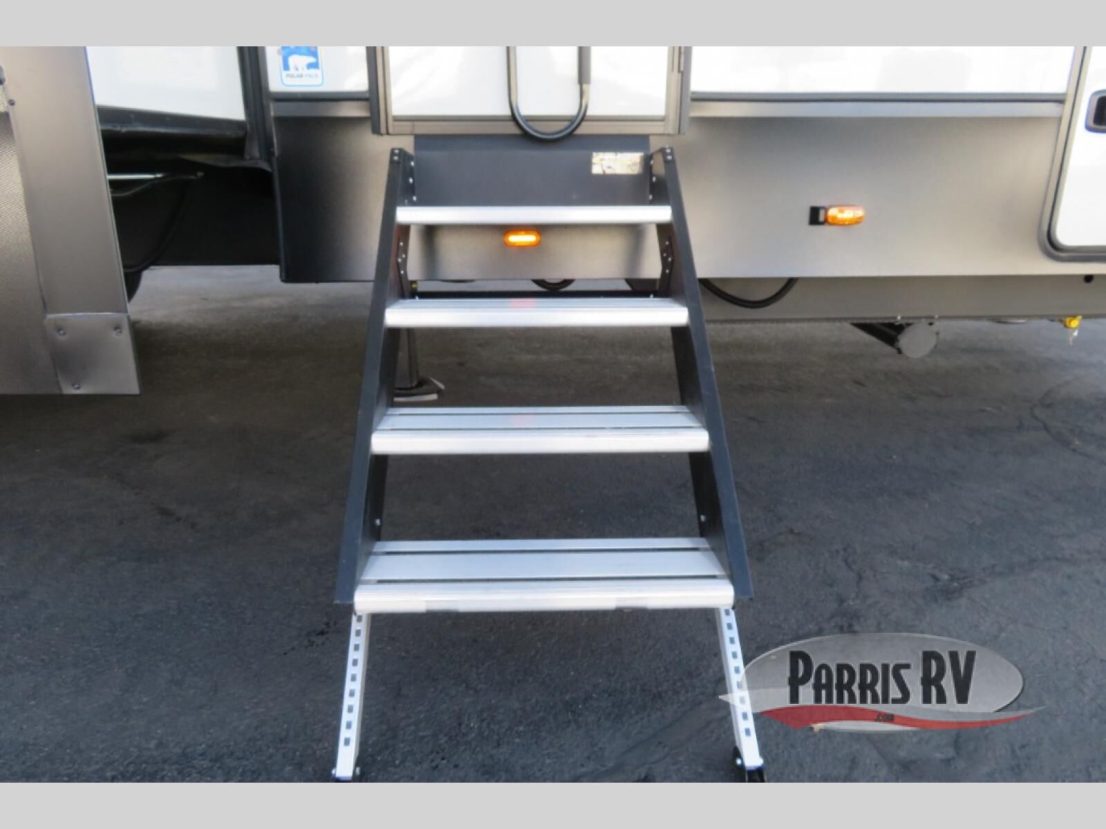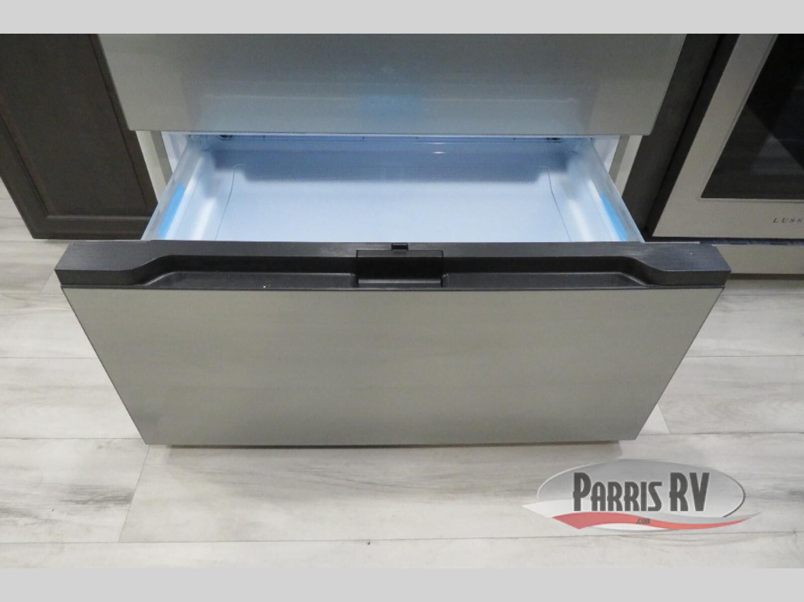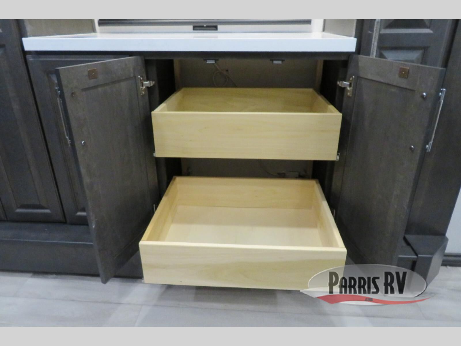 This fifth wheel is decked out in luxuries! The full rear bathroom has a walk-in shower to freshen up in each morning, a dual sink vanity for two to get ready at once, plus washer and dryer prep. You will enjoy a good night's rest on the king bed slide inside the private bedroom and others can sleep on the opposing tri-fold sofa sleeper slides in the living room. There is also a theater seating here, along with a fireplace and 50" LED TV for movie nights. The front kitchen is where it's really at in this fifth wheel; ample counter space, a bar top with stools, pull-out drawers, plus a pantry and closet for even more storage!